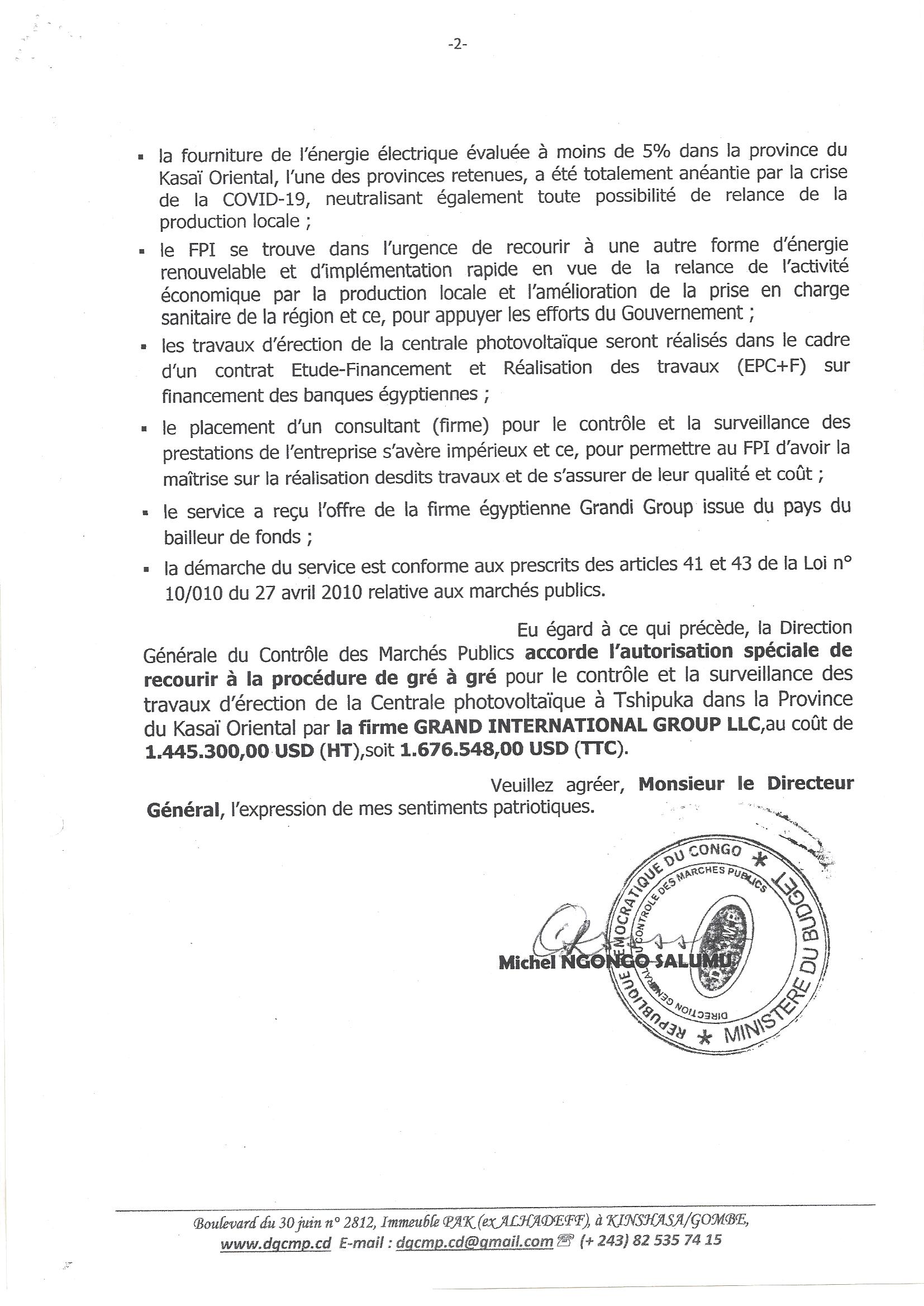 AUTORISATION SPECIALE ACCORDEE A LA FIRME GRAND INTERNATIONAL GROUP LLC RELATIVE AU CONTROLE ET LA SURVEILLANCE DES TRAVAUX D’ERECTION DE LA CENTRE PHOTOVOLTAIQUE DANS LA PROVINCE DU KASAI ORIENTAL.