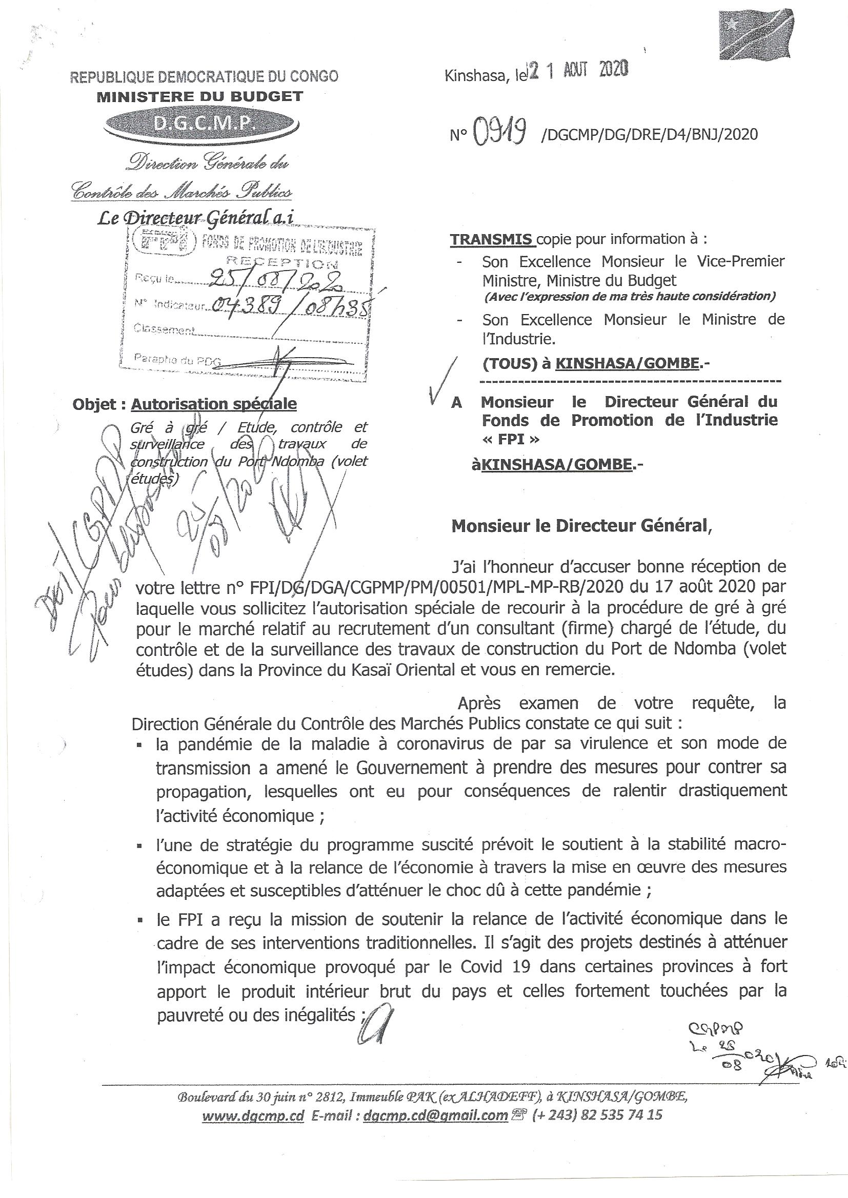 AUTORISATION SPECIALE ACCORDEE AU CONSULTANT GRAND INTERNATIONAL GROUP LLC RELATIVE AU RECRUTEMENT D’UN CONSULTANT (FIRME) CHARGE DE L’ETUDE, DES TRAVAUX DE CONSTRUCTION DU PORT DE NDOMBA DANS LA PROVINCE DU KASAI ORIENTAL.