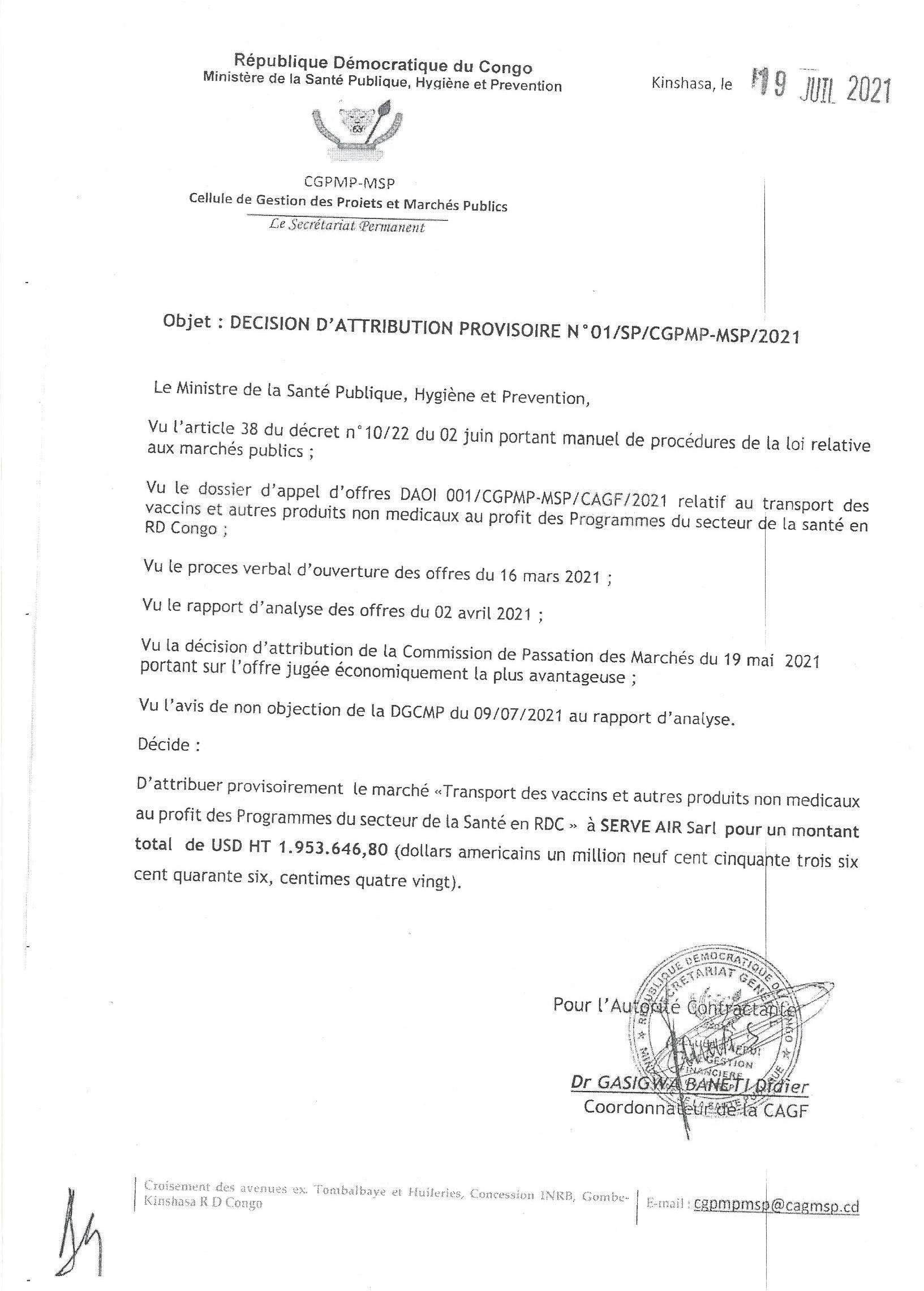 Marché de transport des vaccins et autres produits non médicaux au profit des programmes du secteur de la santé en RDC à SERVE AIR SARL