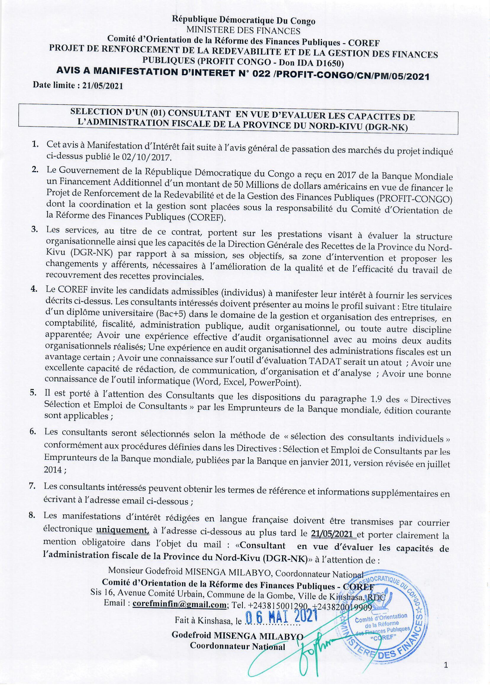 SELECTION D’UN (01) CONSULTANT EN VUE D’EVALUER LES CAPACITES DE L’ADMINISTRATION FISCALE DE LA PROVINCE DU NORD-KIVU (DGR-NK).