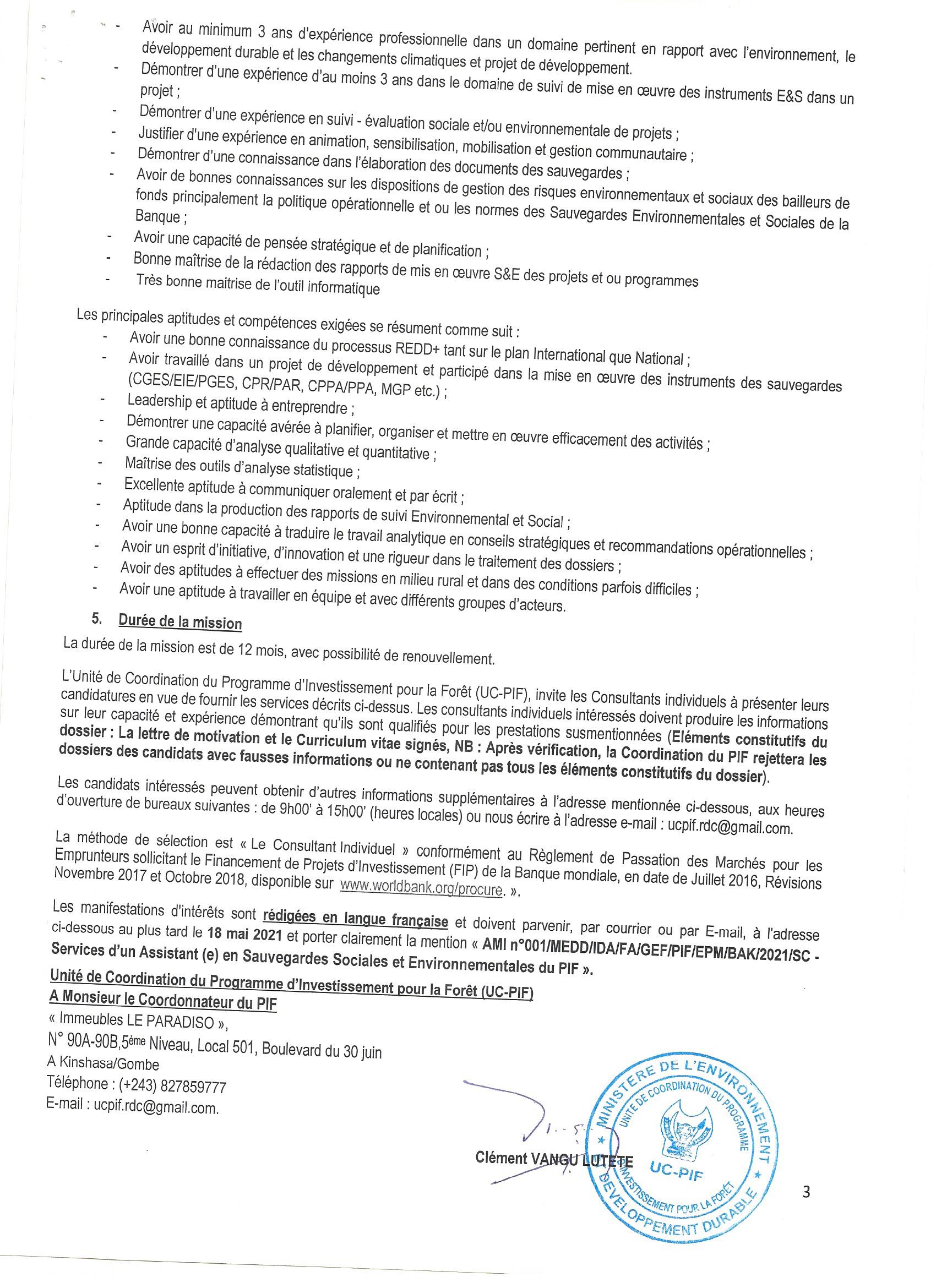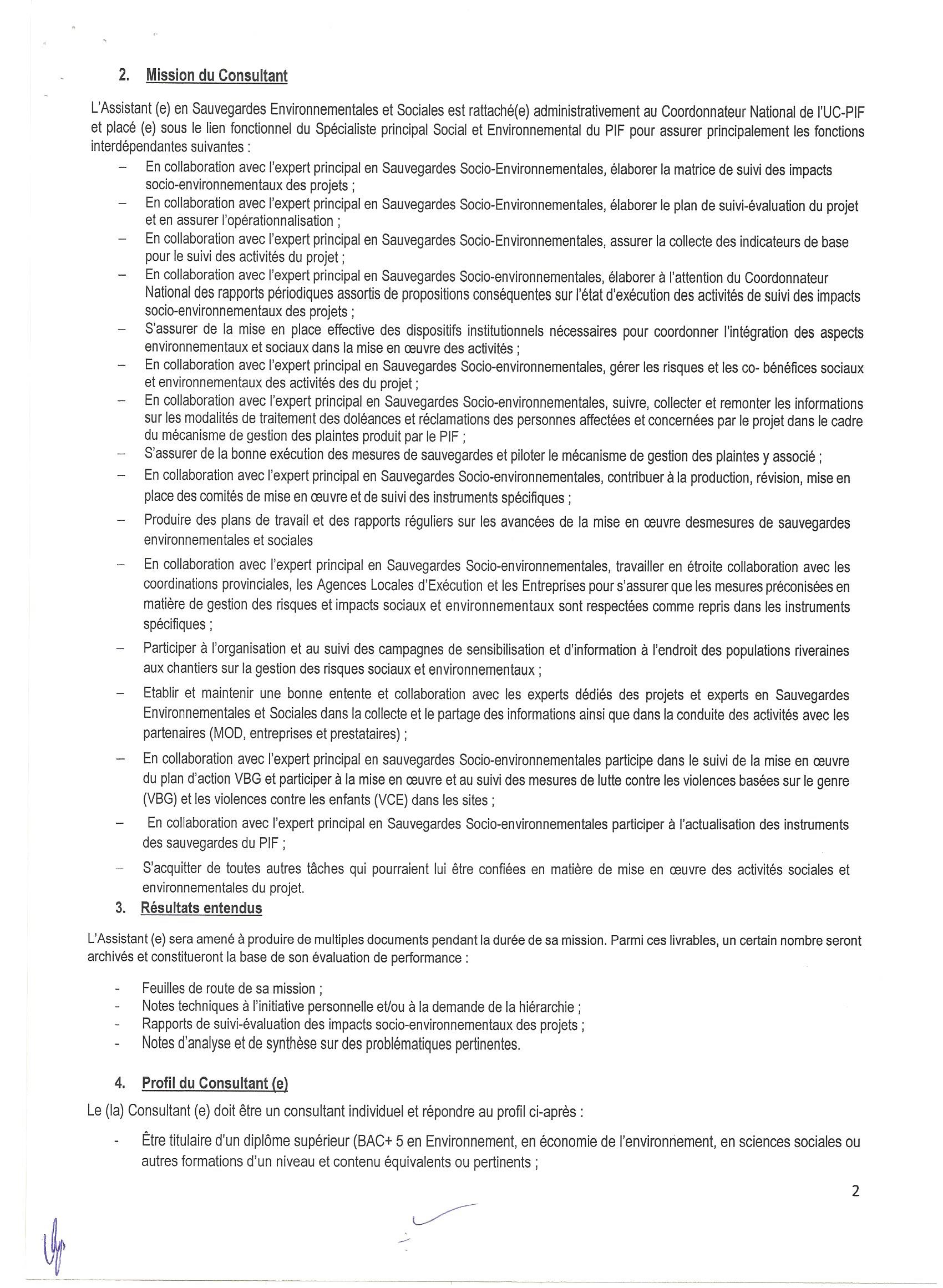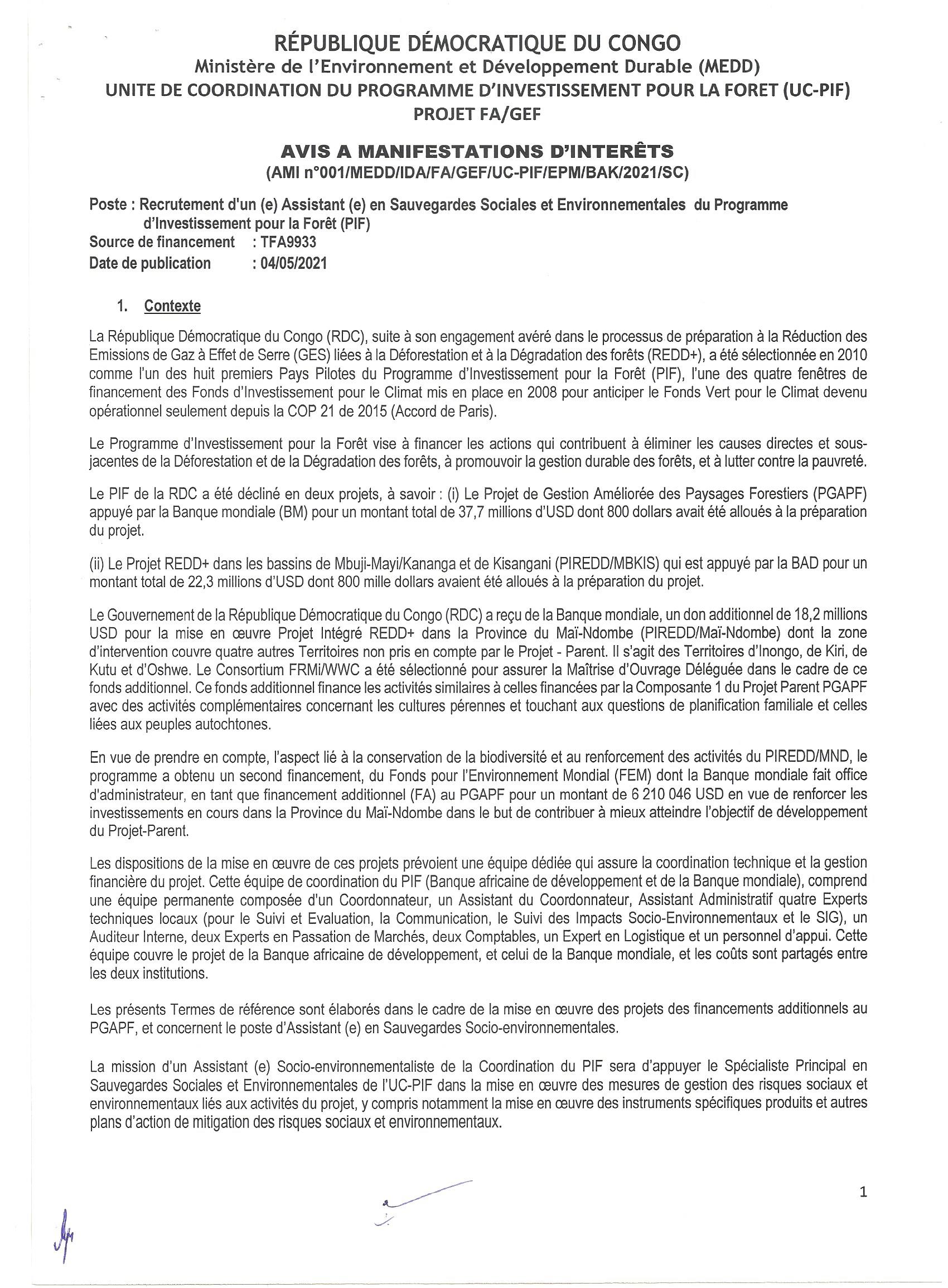 AVIS A MANIFESTATION D’INTERET RELATIF AU RECRUTEMENT D’UN(E) ASSISTANT(E) EN SAUVEGARDES SOCIALES ENVIRONNEMENTALES DU PROGRAMME D’INVESTISSEMENT POUR LA FORET(PIF)