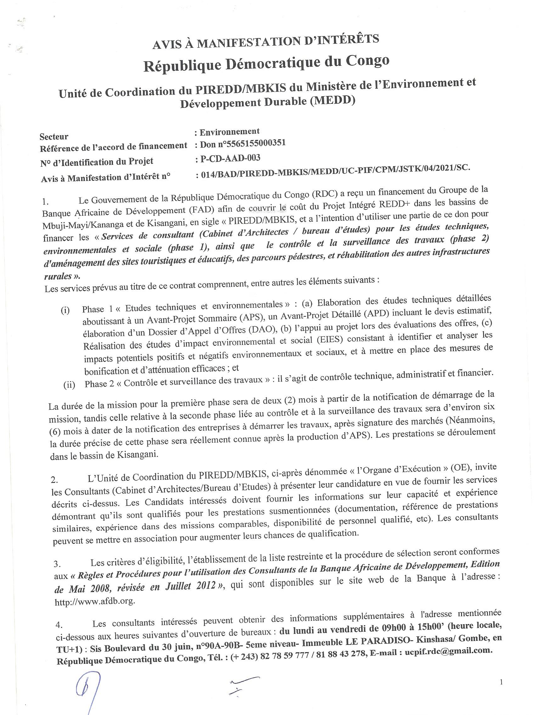 SERVICE DE CONSULTANT (CABINET OU BUREAU D’ETUDE) POUR LES ETUDES TECHNIQUES, ENVIRONNEMENTALES ET SOCIALES, ET POUR LE CONTROLE ET LA SURVEILLANCE DES TRAVAUX D’AMENAGEMENT DES SITES TOURISTIQUES ET EDUCATIFS,…