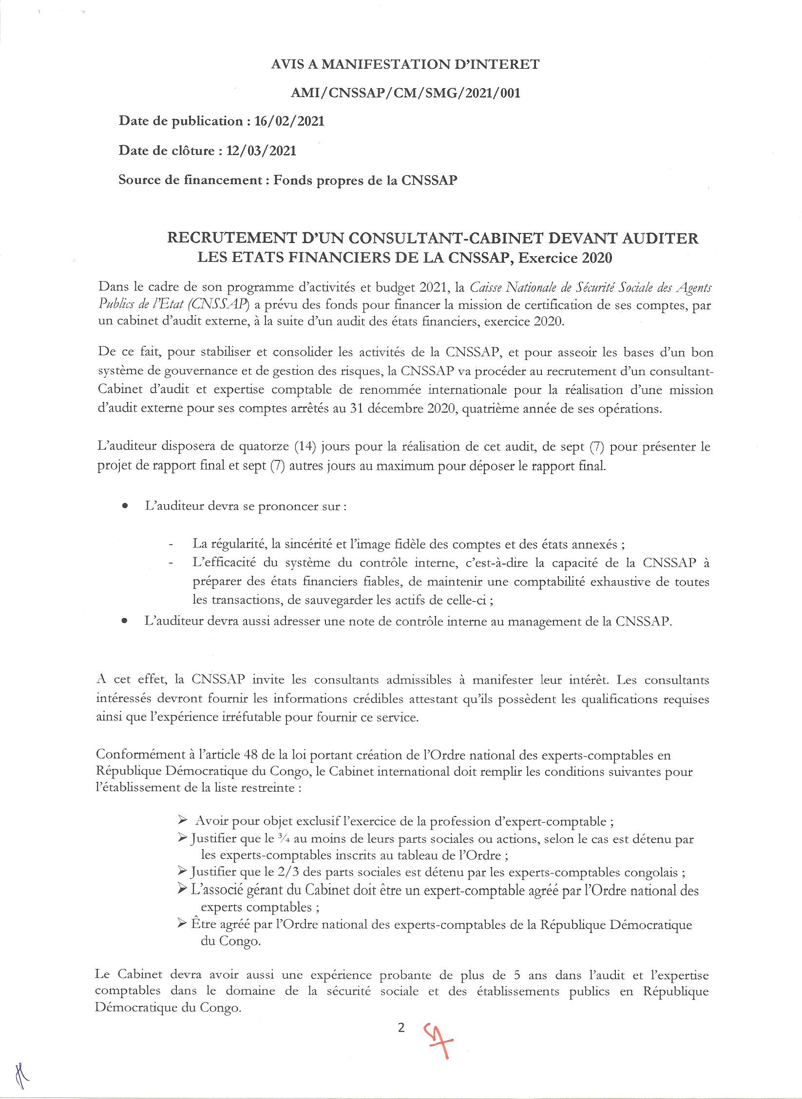 Recrutement d’un consultant-cabinet devant auditer les états financiers de la CNSSAP, Exercice 2020.