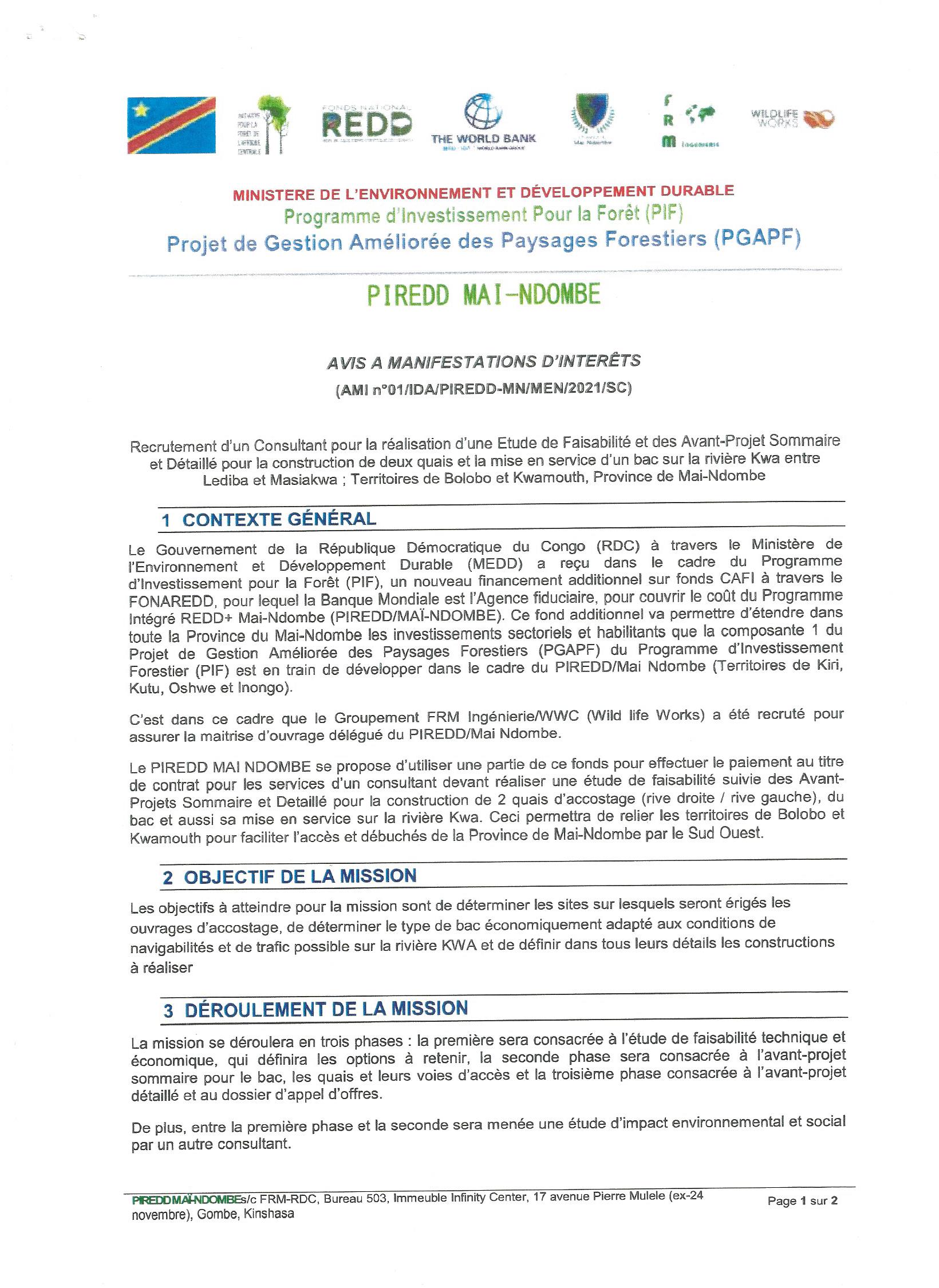 Recrutement d’un Consultant pour la réalisation d’une Étude de Faisabilité et des Avant-Projet Sommaire et Détaillé pour la construction de deux quais en service d’un bac sur la rivière Kwa entre Lediba et Masiakwa : Territoires de Bolobo et Kwamouth, Province de Mai-Ndombe