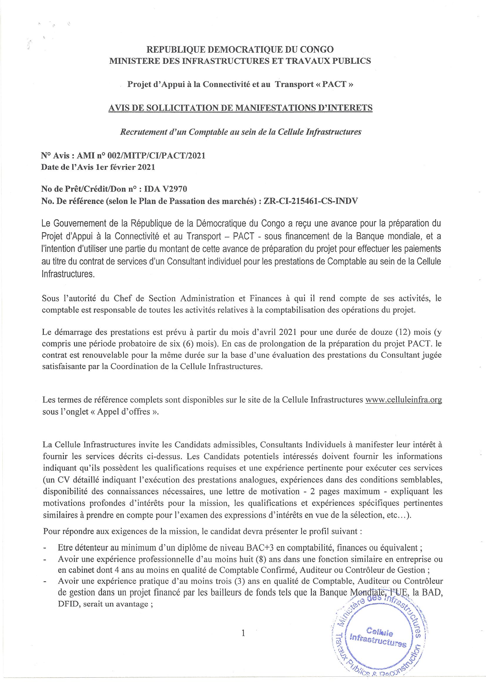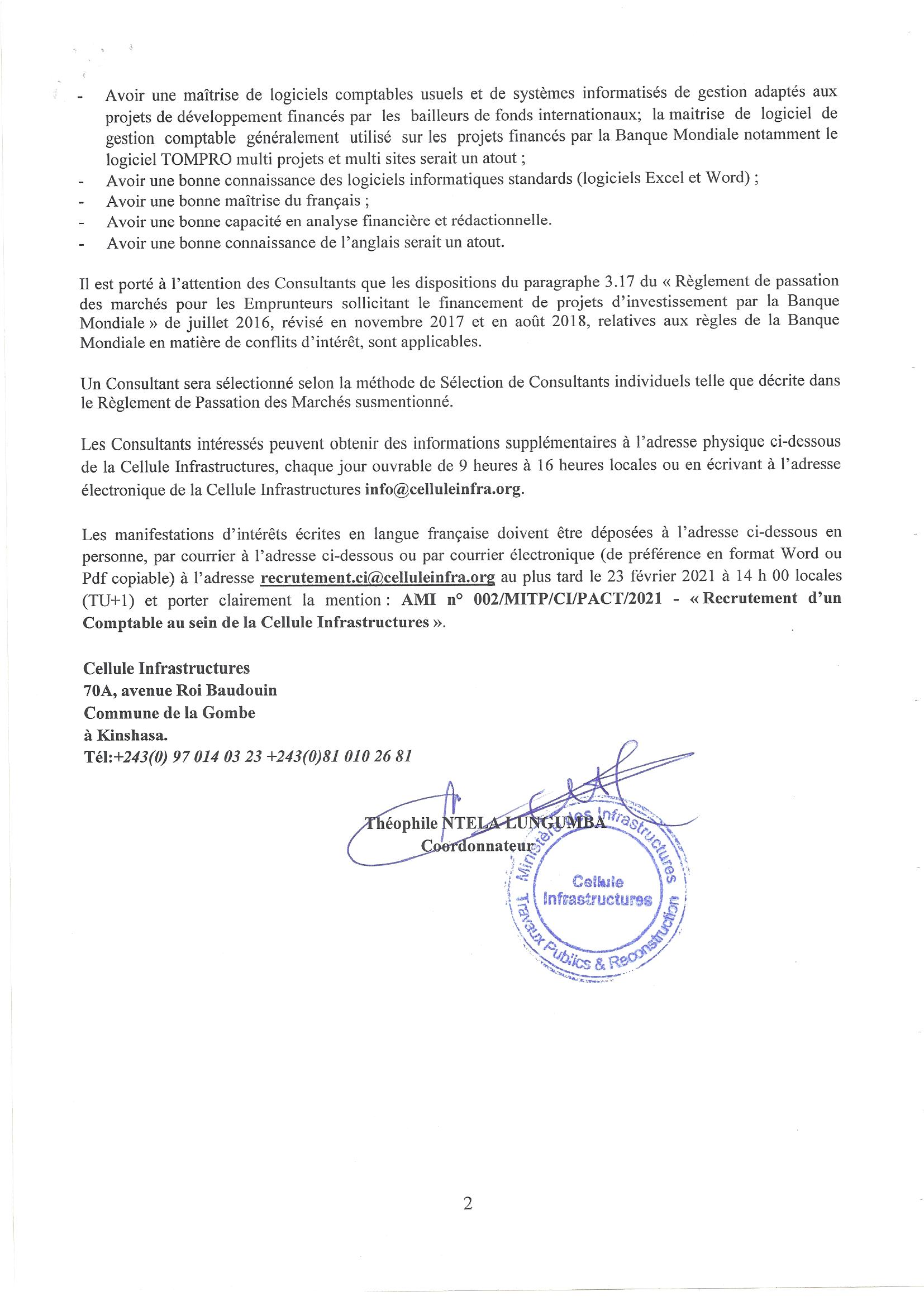 Recrutement d’un comptable au sein de la cellule infrastructures.