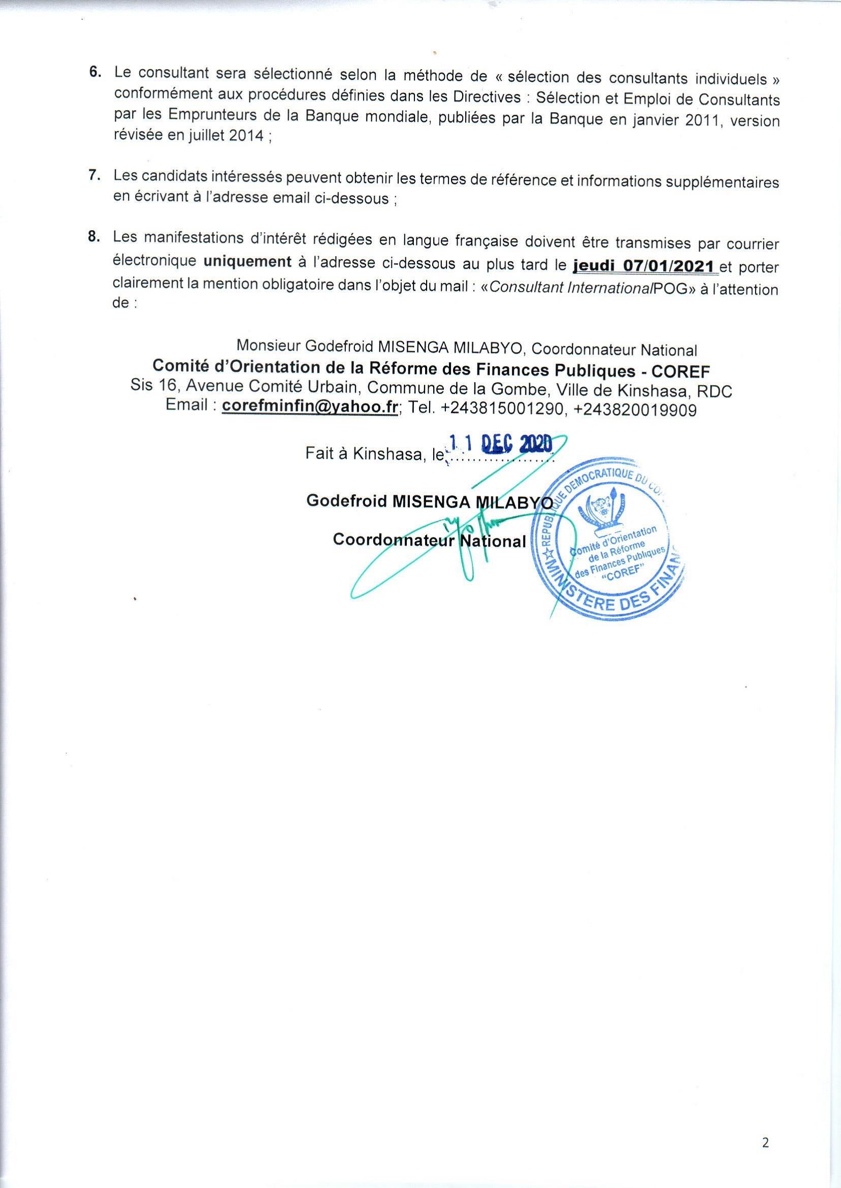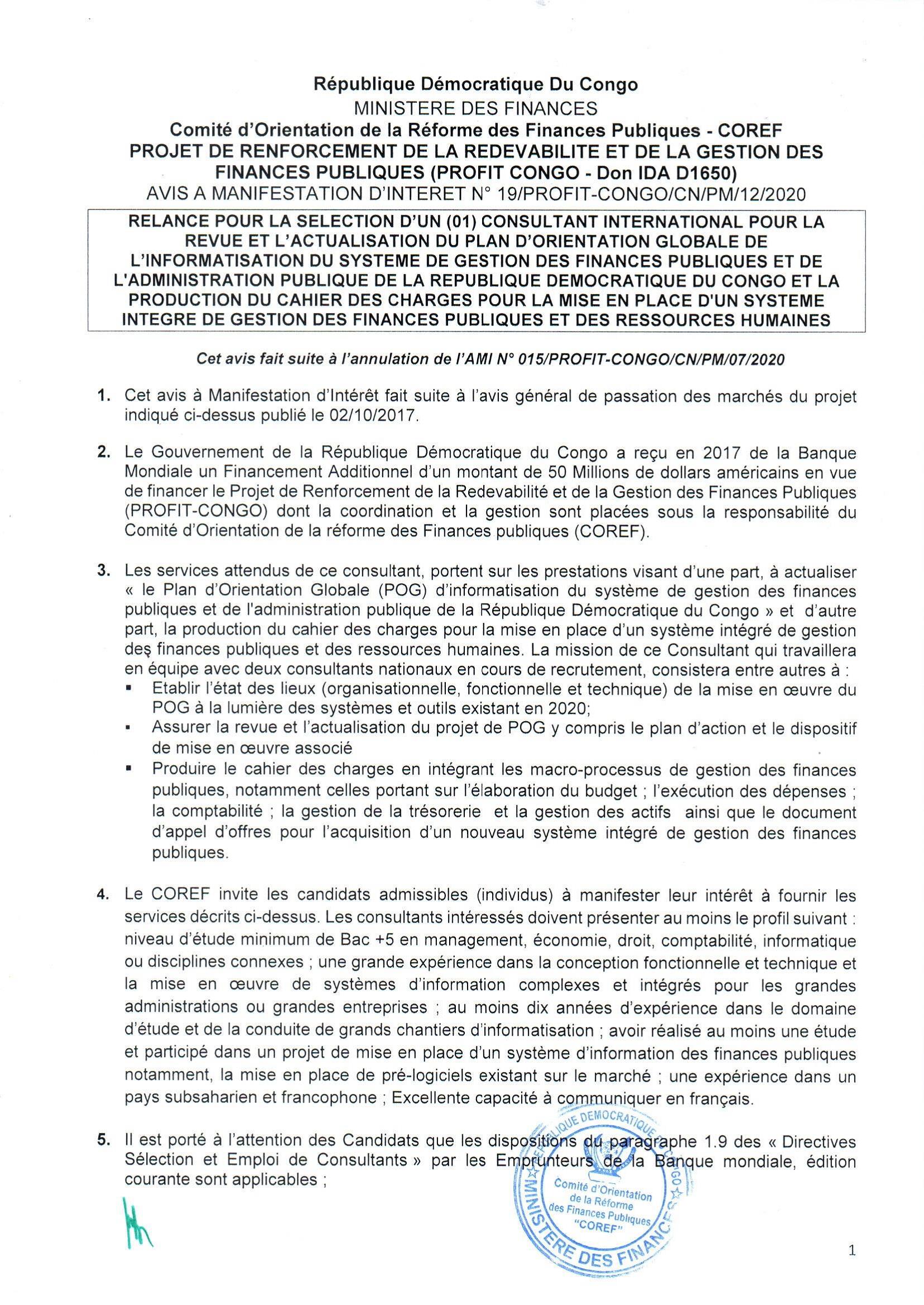 Avis d’annulation de consultation N°015/PROFIT-CONGO/CN/PM/07/2020 relative a la sélection d’un (01) consultant international pour la revue et l’actualisation du plan d’orientation globale de l’informatisation du système de gestion des finances publiques…