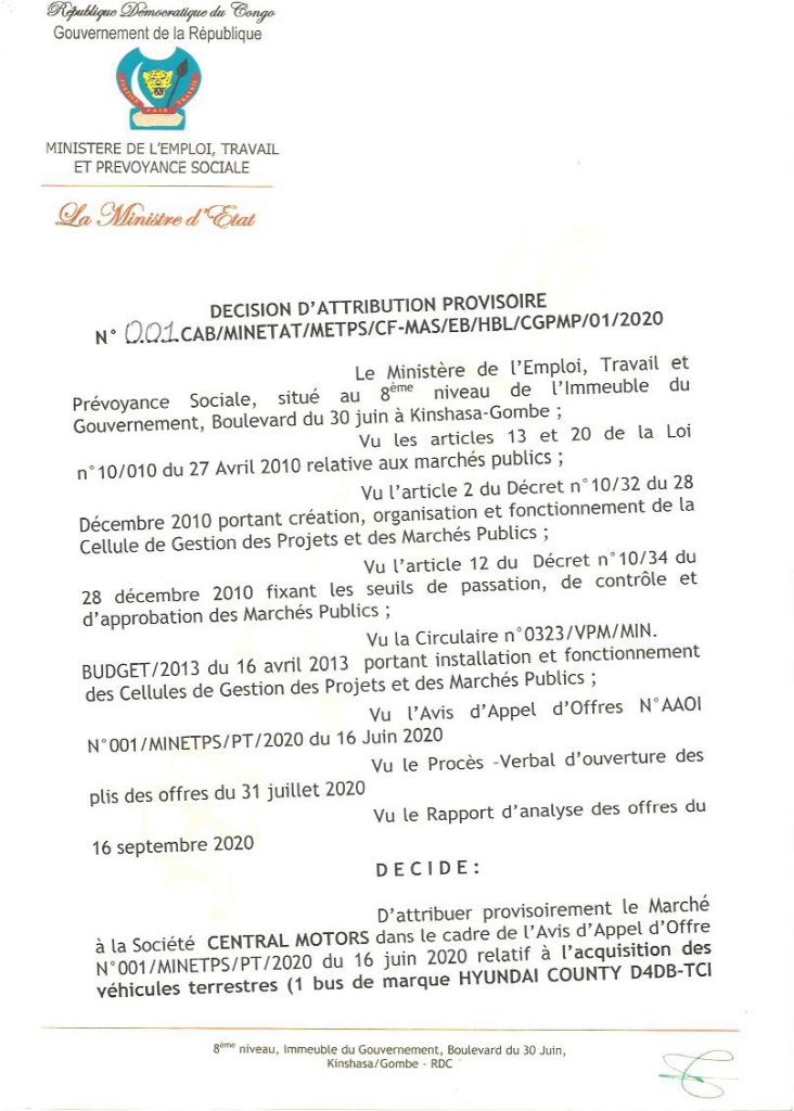 Attribution provisoire du marché relatif à l’acquisition des véhicules terrestres à la société central Motors