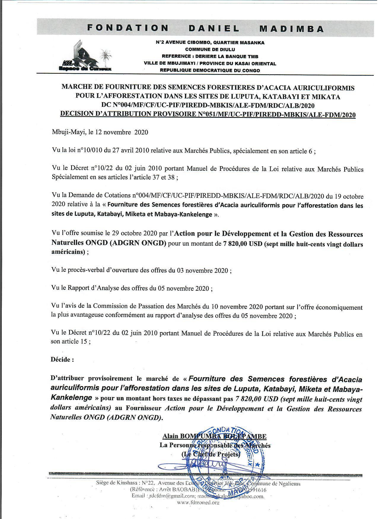 Attribution provisoire du marché de fourniture des semences forestières d’acacia auriculiformis pour l’afforestation dans les sites de luputa, katabayi, miketa et mabaya-kankelenga au fournisseur adgrn ongd.