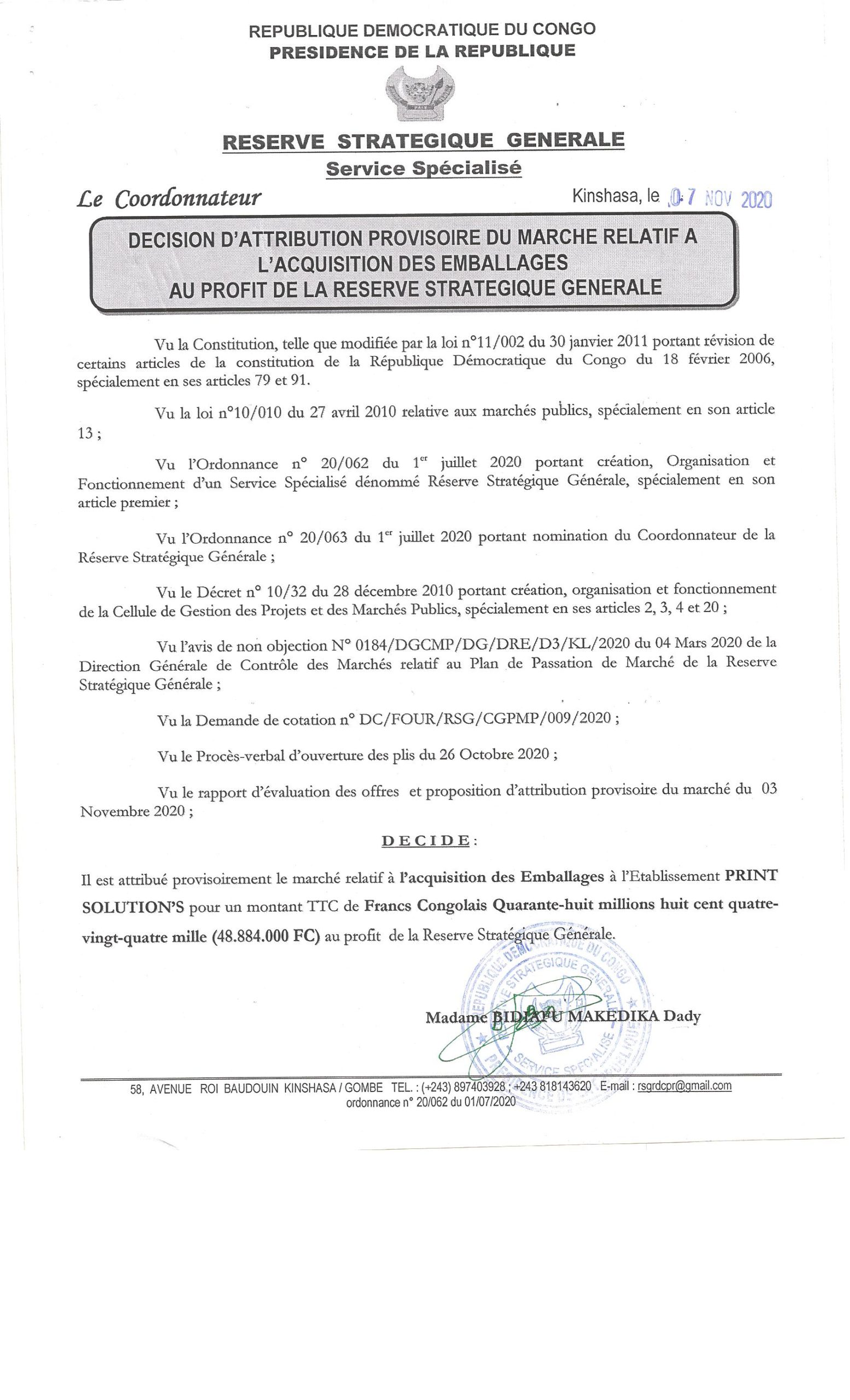 Attribution provisoire du marché relatif à l’acquisition des emballages