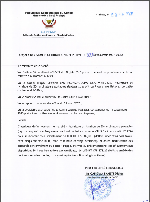 Attribution définitive du marché relatif à la fourniture et la livraison des ordinateurs (laptop) au profit du programme national de lutte contre le VIH/SIDA