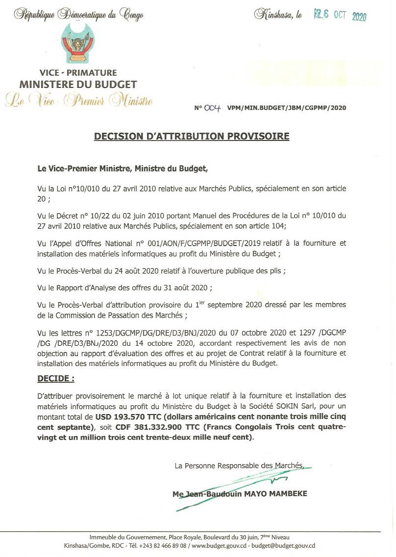 Attribution définitive du marché accordée à l’établissements lokela relative à la livraison d’équipements informatiques au profit du secrétariat général de la reconstruction.