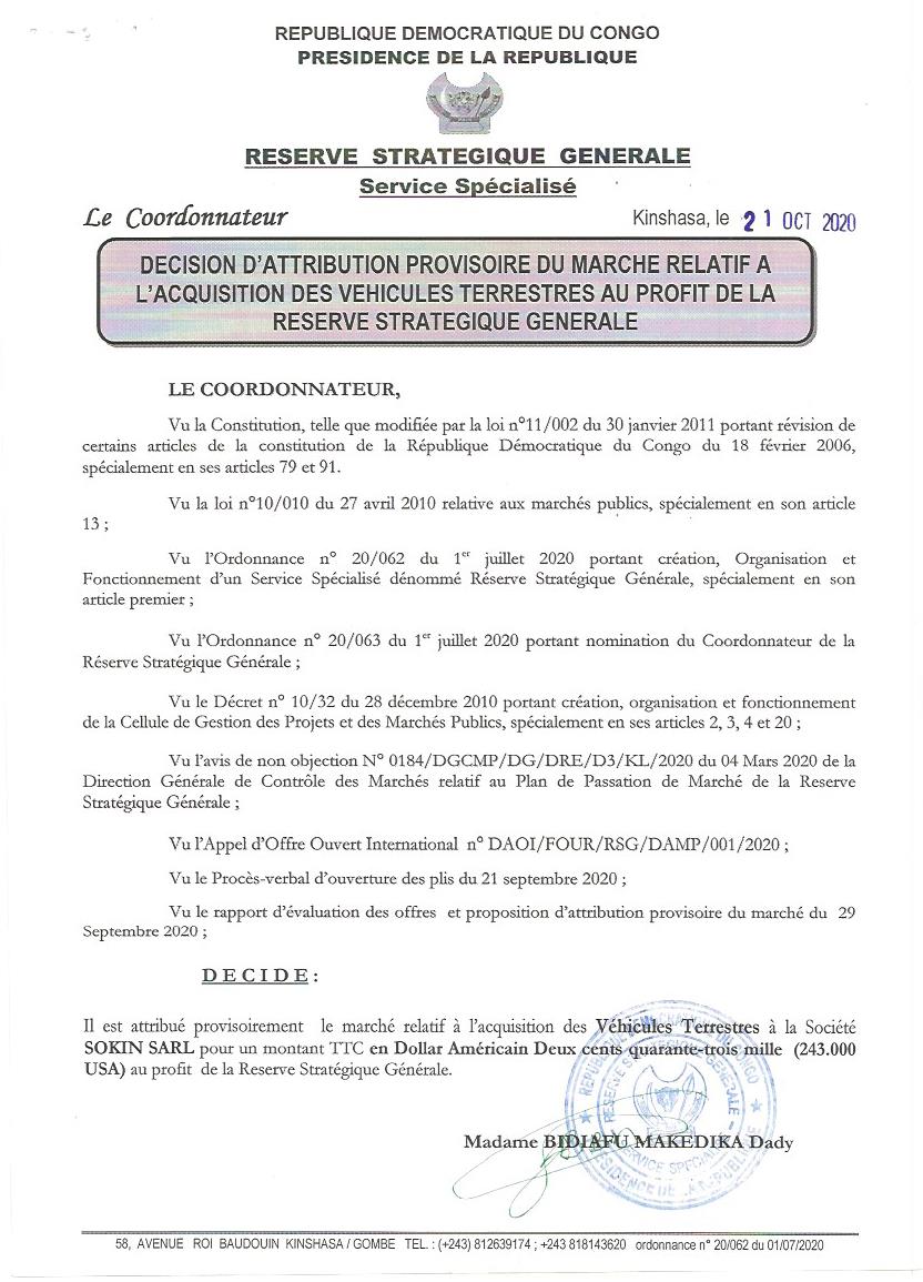Attribution provisoire de marché à la société sokin Sarl relatif à l’acquisition des véhicules terrestres