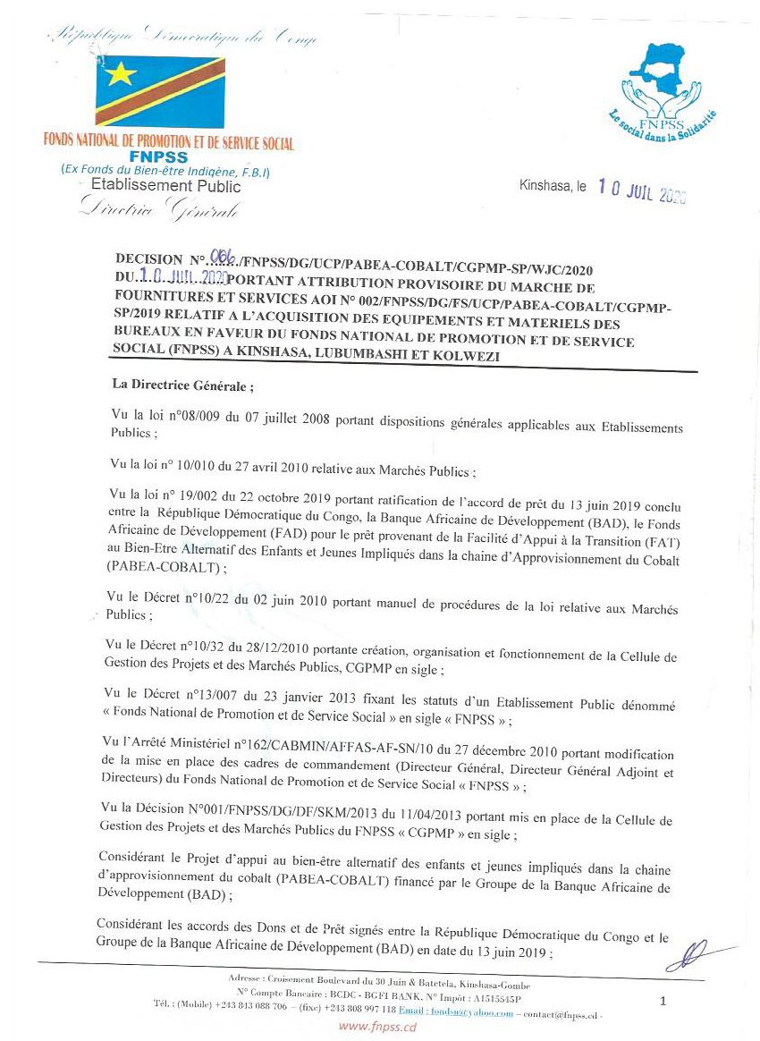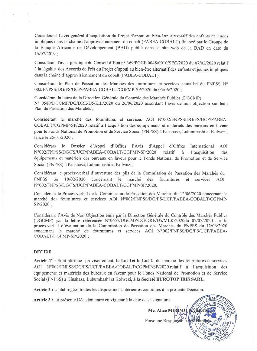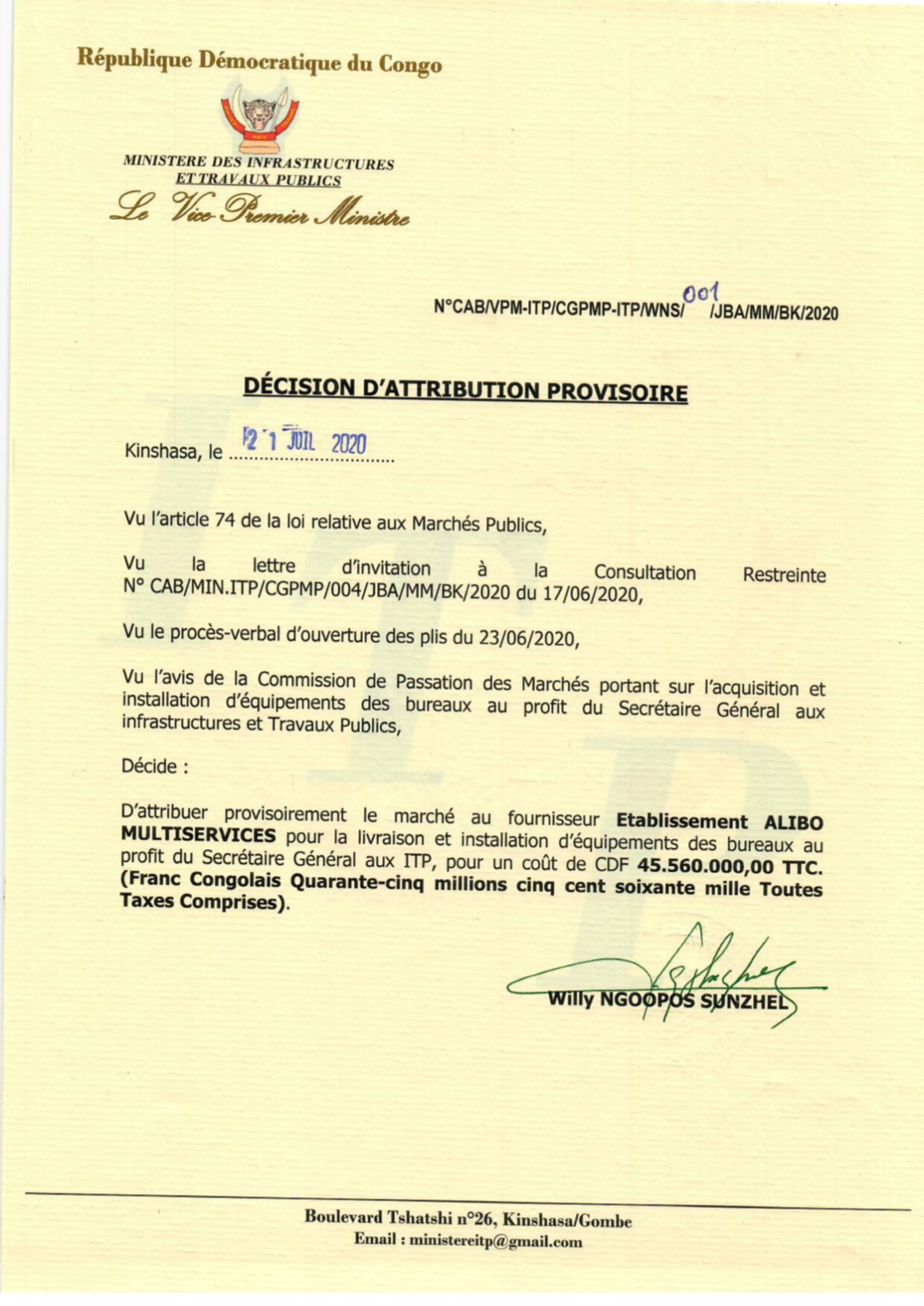 Attribution provisoire relatif à la livraison et l’installation d’équipements des bureaux au profit du secrétaire général aux itp aux établissements ALIBO multiservices