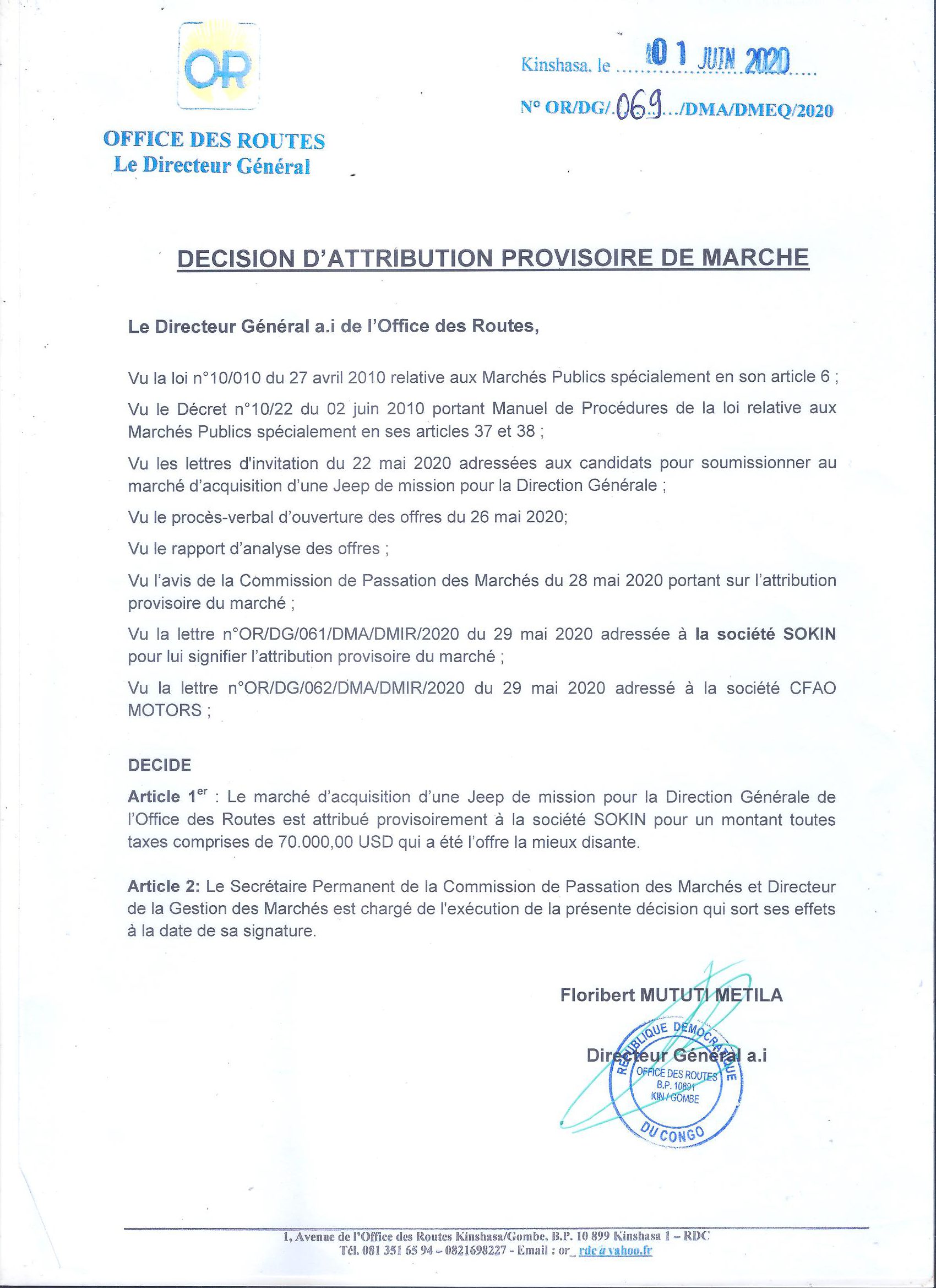 Attribution provisoire du marché relatif à l’acquisition d’une jeep de mission pour la direction générale de l’office des routes a la société SOKIN