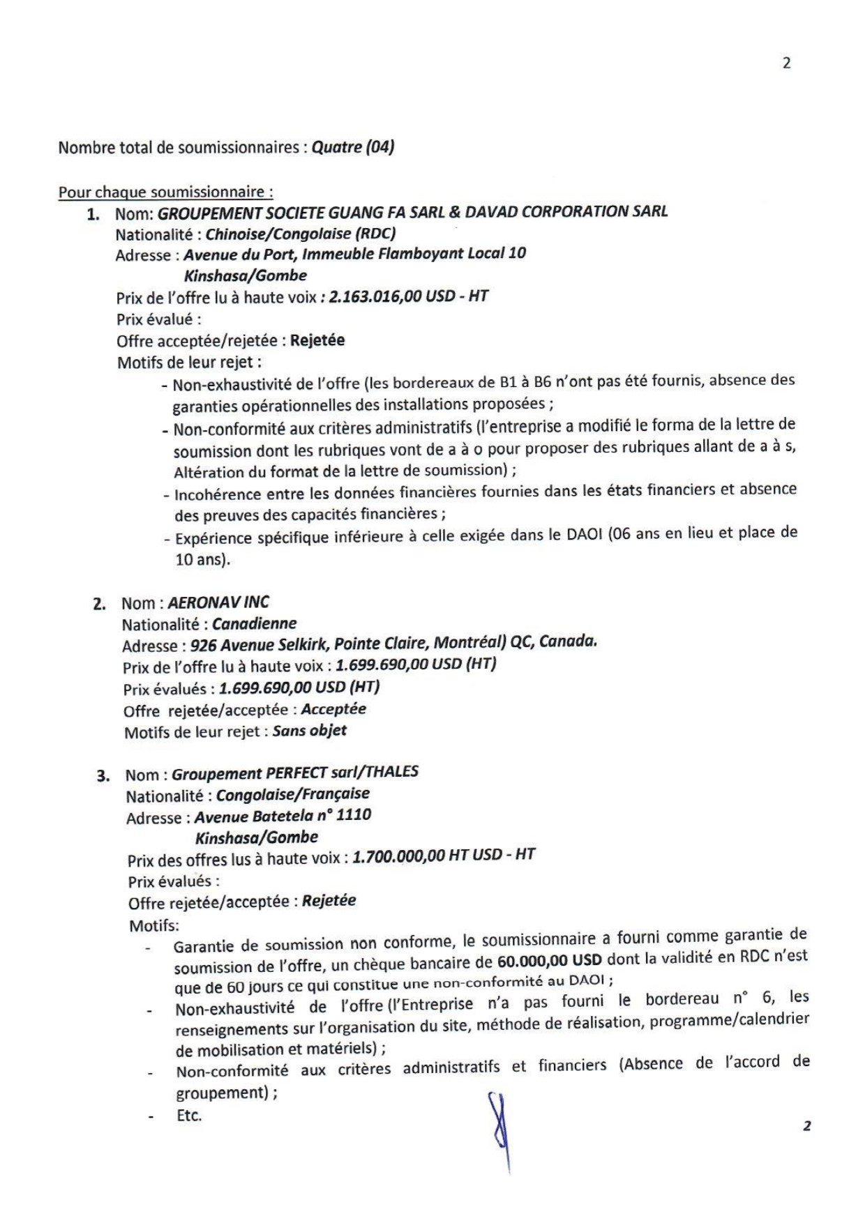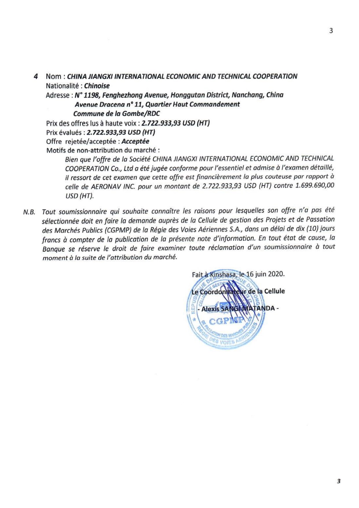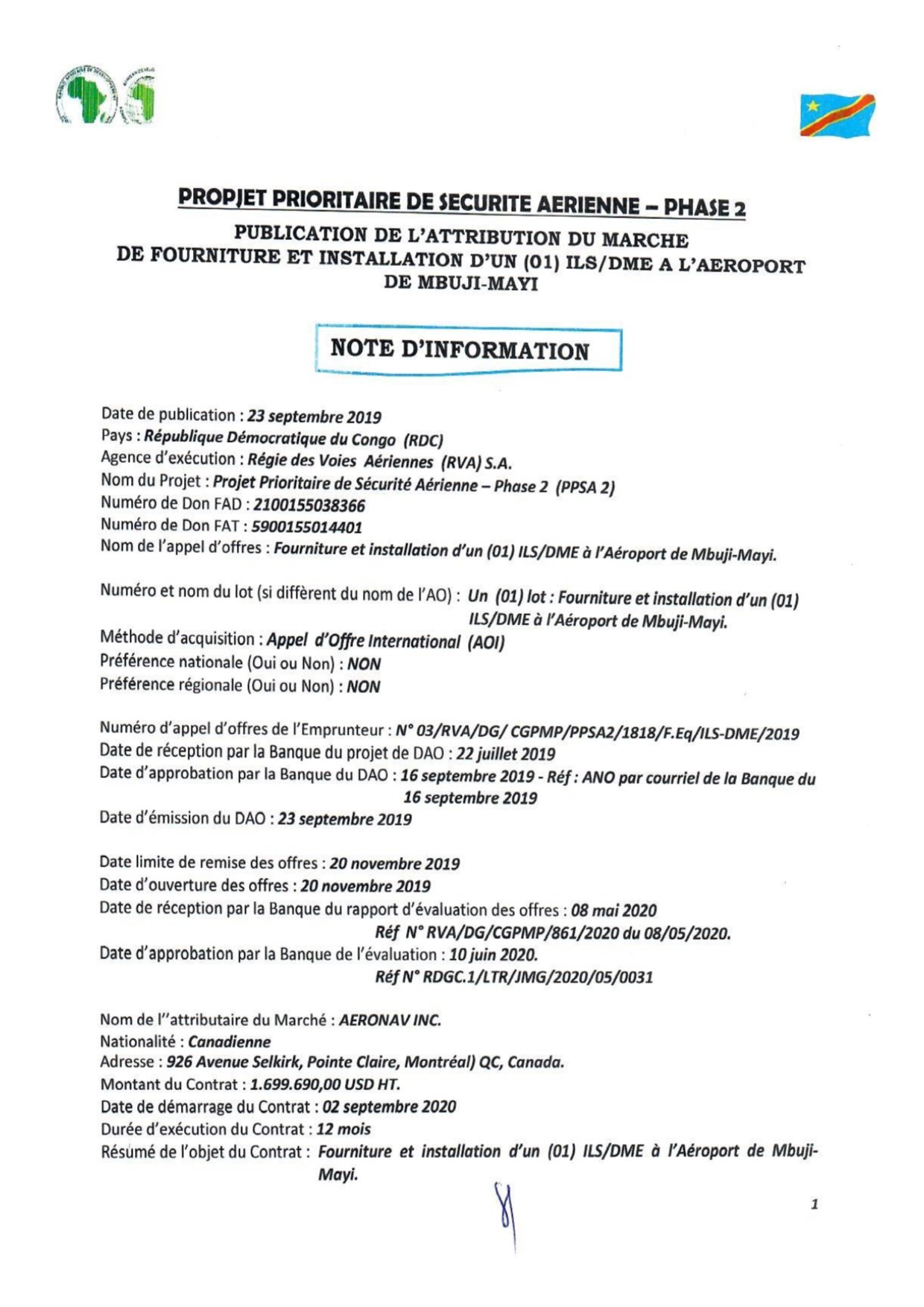 Attribution provisoire du marché relatif à la fourniture et installation d’un (01) ils/dme a l’aéroport de Mbuji-Mayi