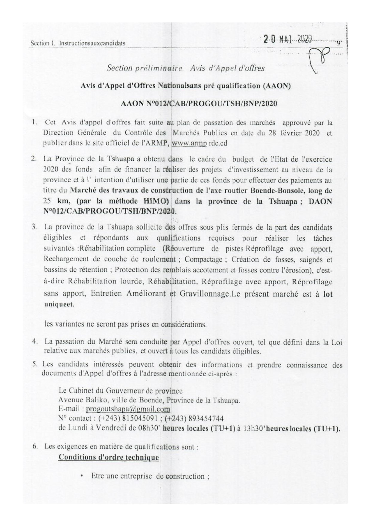 TRAVAUX DE REHABILITATION ET ENTRETIEN DES ROUTES DE DESSERTES AGRICOLES DES SECTEURS DE LA PROVINCE DE LA TSHUAPA