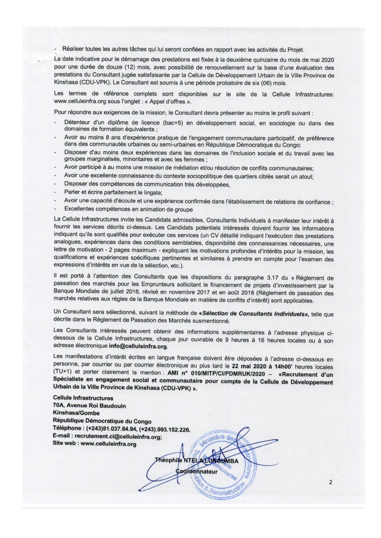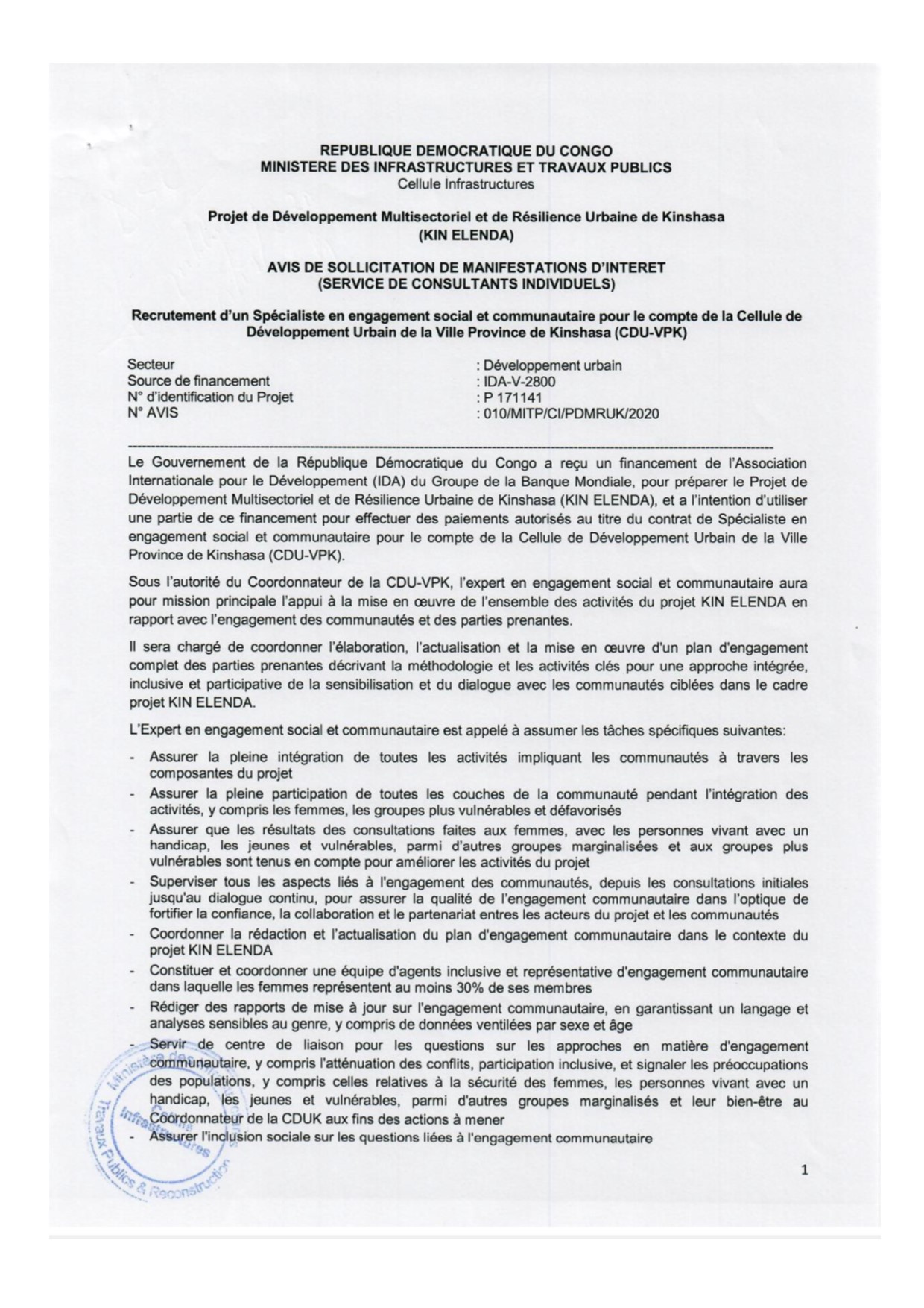 RECRUTEMENT D’UN SPÉCIALISTE EN ENGAGEMENT SOCIAL ET COMMUNAUTAIRE POUR LE COMPTE DE LA CELLULE DE DÉVELOPPEMENT URBAIN DE LA VILLE DE KINSHASA (CDU-VPK)