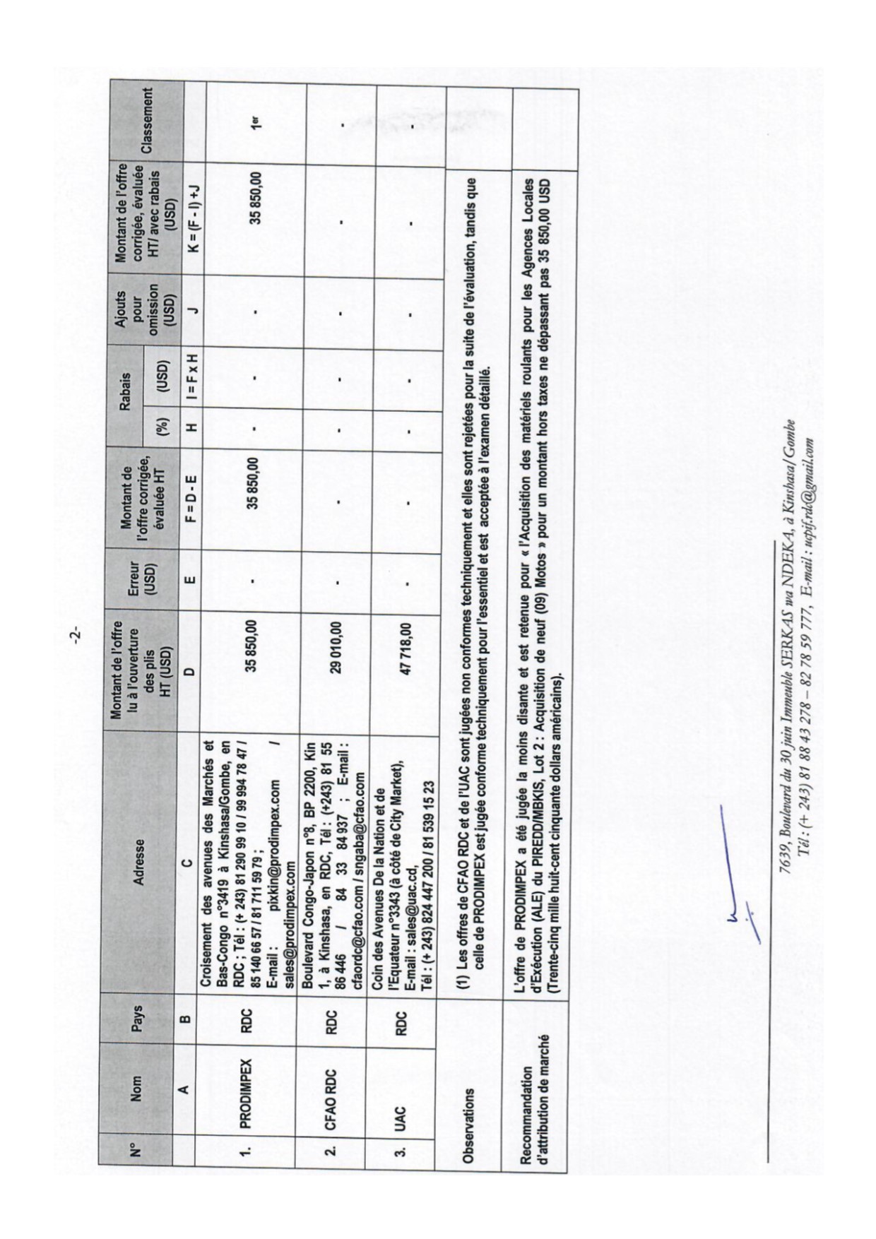Attribution provisoire du marché relatif à la fourniture des motos a l’entreprise PRODIMPEX