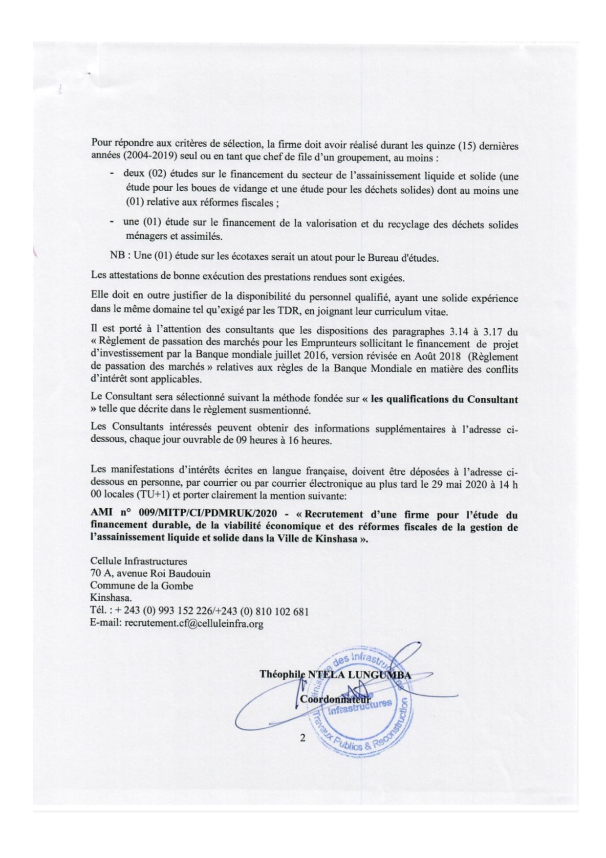 RECRUTEMENT D’UN CONSULTANT (FIRME) POUR L’ÉTUDE DU FINANCEMENT DURABLE, DE LA VIABILITÉ ÉCONOMIQUE ET DES REFORMES FISCALES DE LA GESTION DE L’ASSAINISSEMENT LIQUIDE ET SOLIDE DANS LA VILLE DE KINSHASA