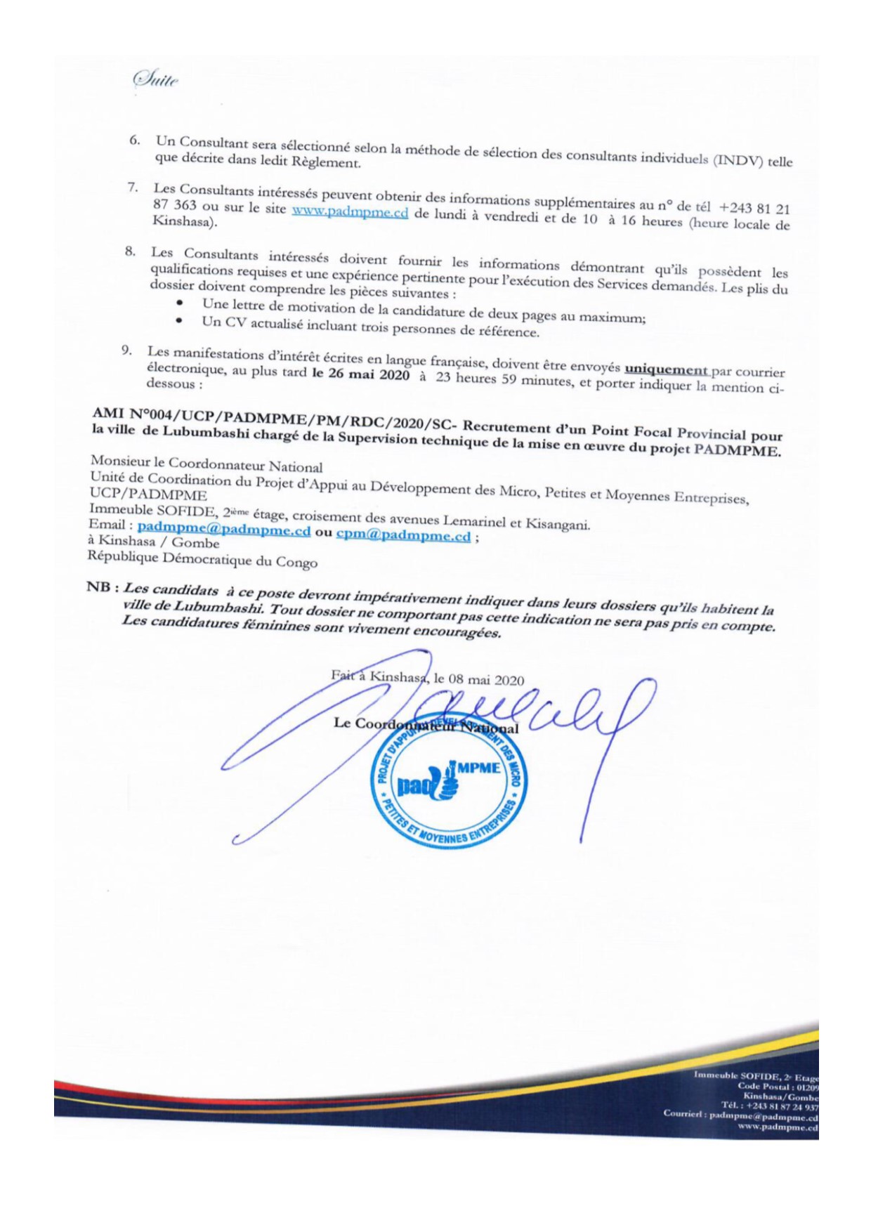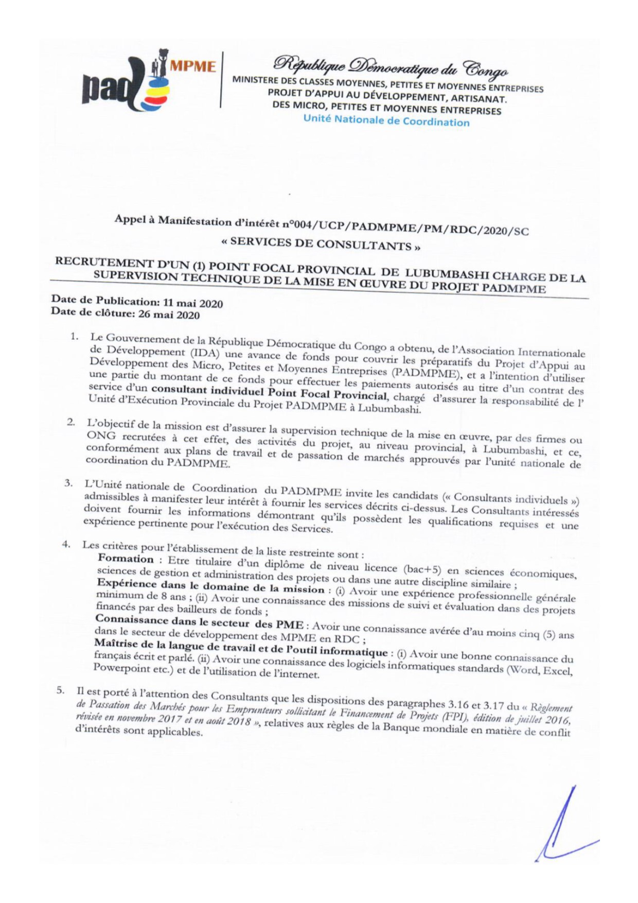 RECRUTEMENT D’UN POINT FOCAL PROVINCIAL DE LUBUMBASHI CHARGÉ DE LA SUPERVISION TECHNIQUE DE LA MISE EN OEUVRE DU PROJET PADMPME