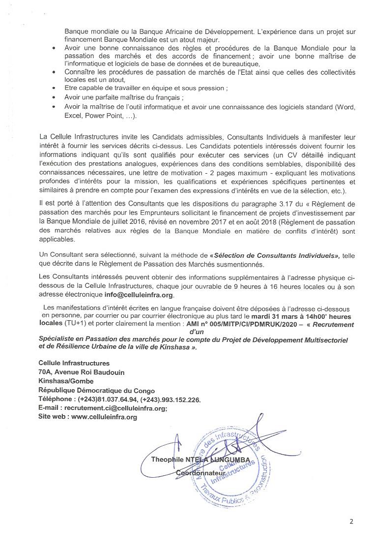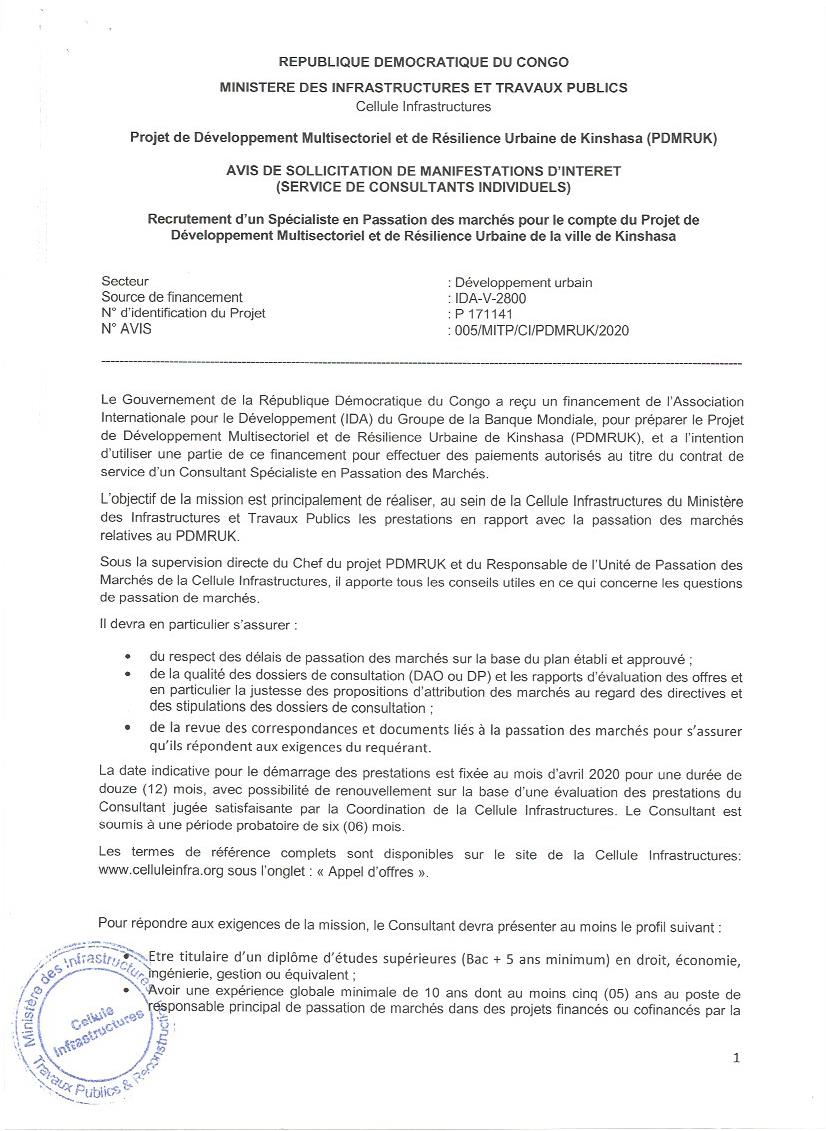 RECRUTEMENT D’UN SPÉCIALISTE EN PASSATION DES MARCHÉS POUR LE COMPTE DU PROJET DE DÉVELOPPEMENT MULTISECTORIEL ET DE RÉSILIENCE URBAINE DE LA VILLE DE KINSHASA.