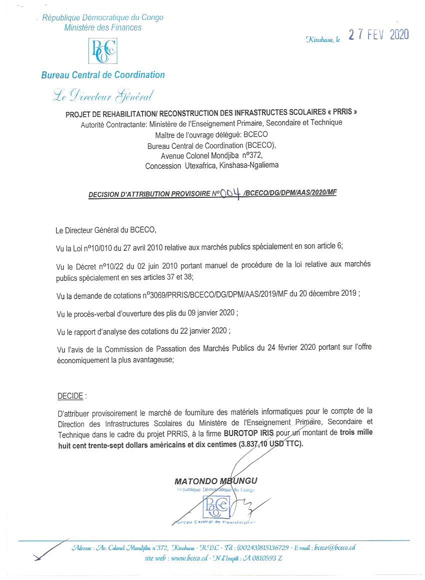 Attribution provisoire du marché de fourniture des matériels pour le compte de la direction des infrastructures sociales du ministère de l’enseignement primaire et secondaire et technique au profit de la firme BUROTOP IRIS