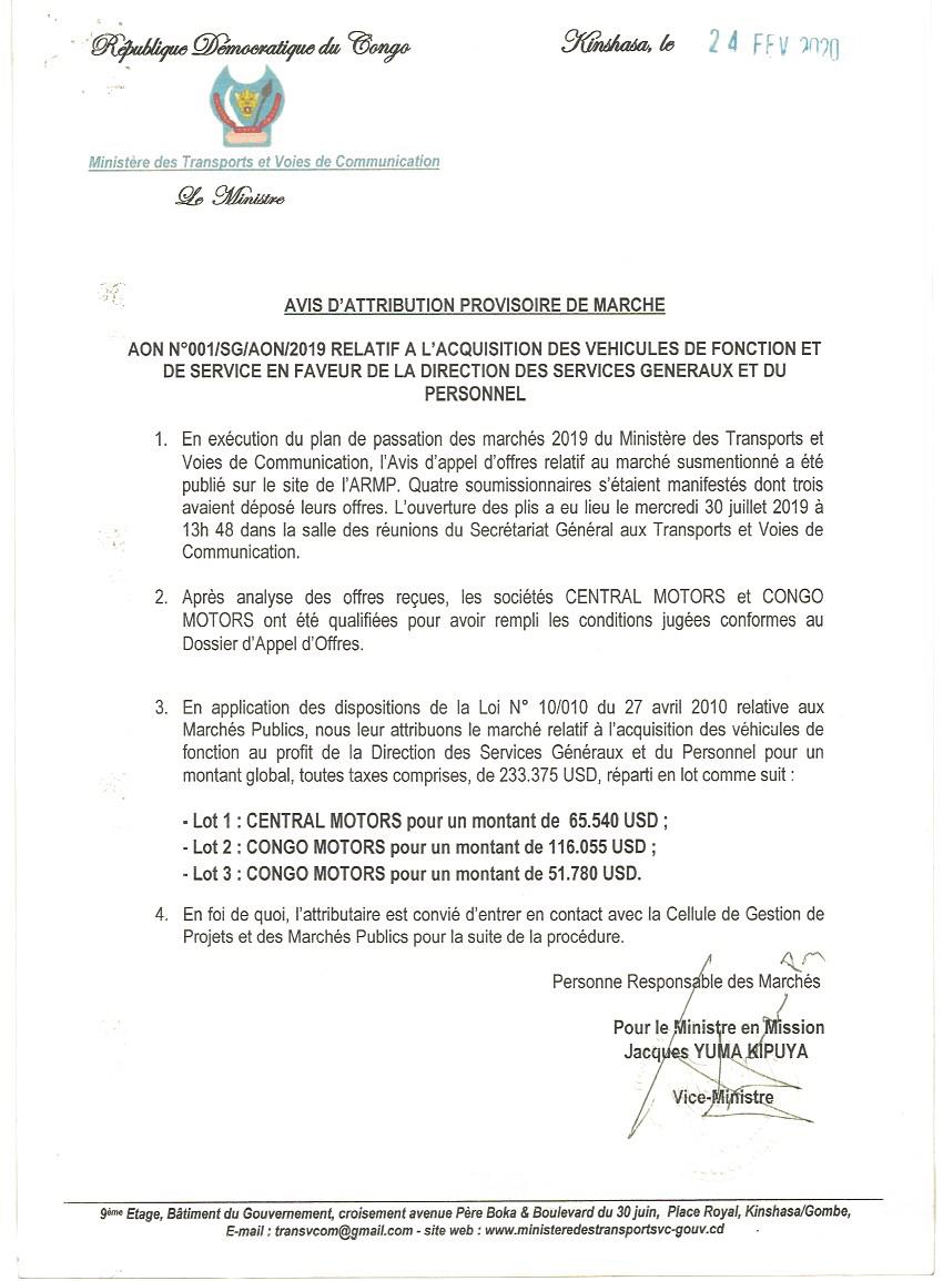 Avis d’attribution provisoire relatif à l’acquisition des véhicules de fonction et de service en faveur la direction des services généraux et du personnel.
