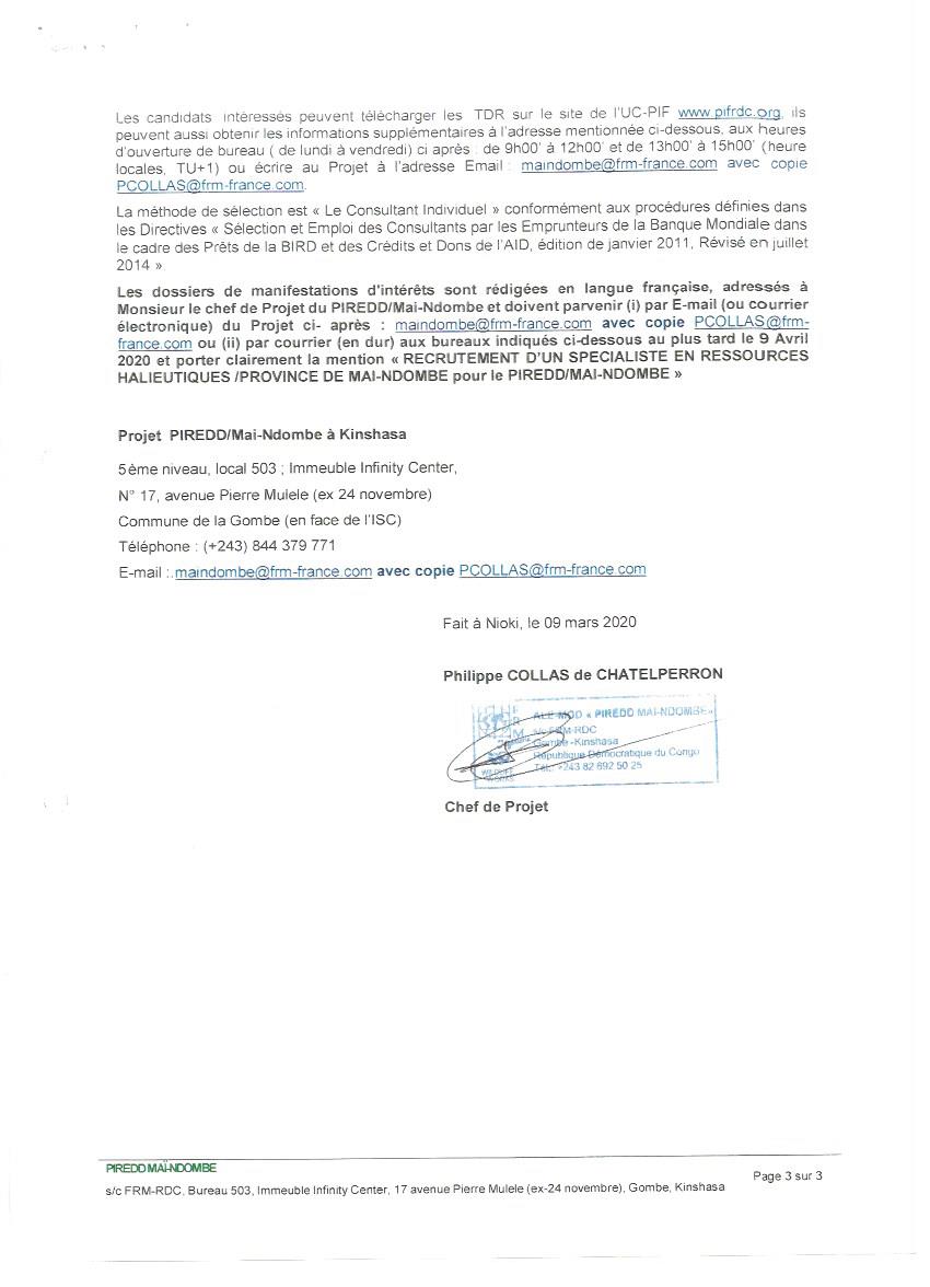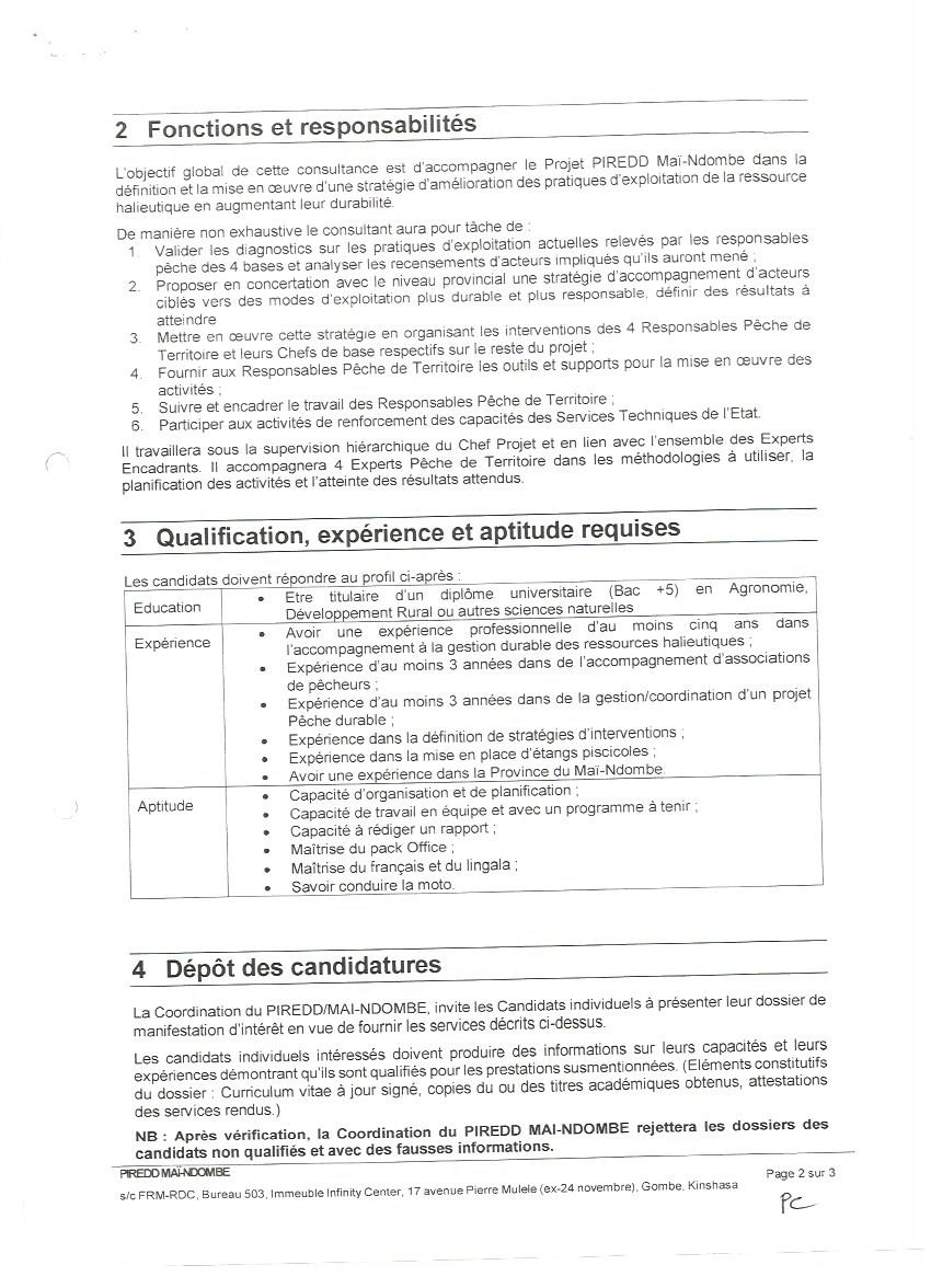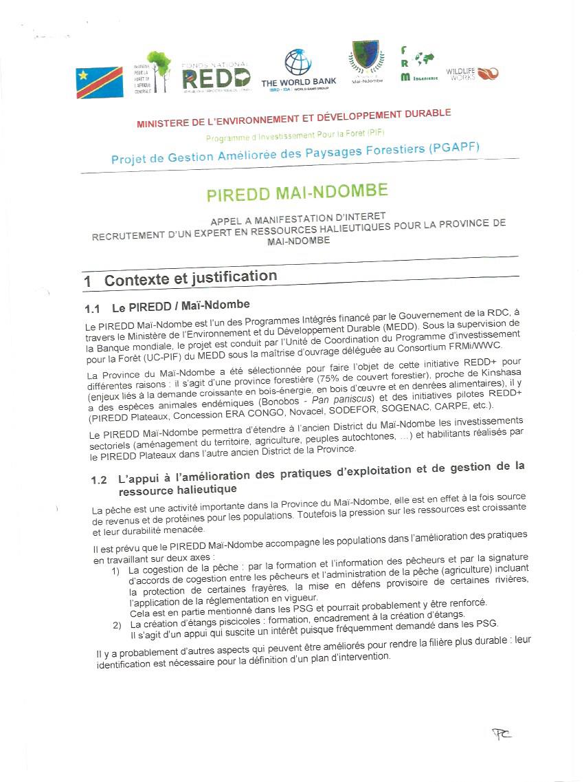 RECRUTEMENT D’UN EXPERT EN RESSOURCES HALIEUTIQUES POUR LA PROVINCE DE MAY-NDOMBE.