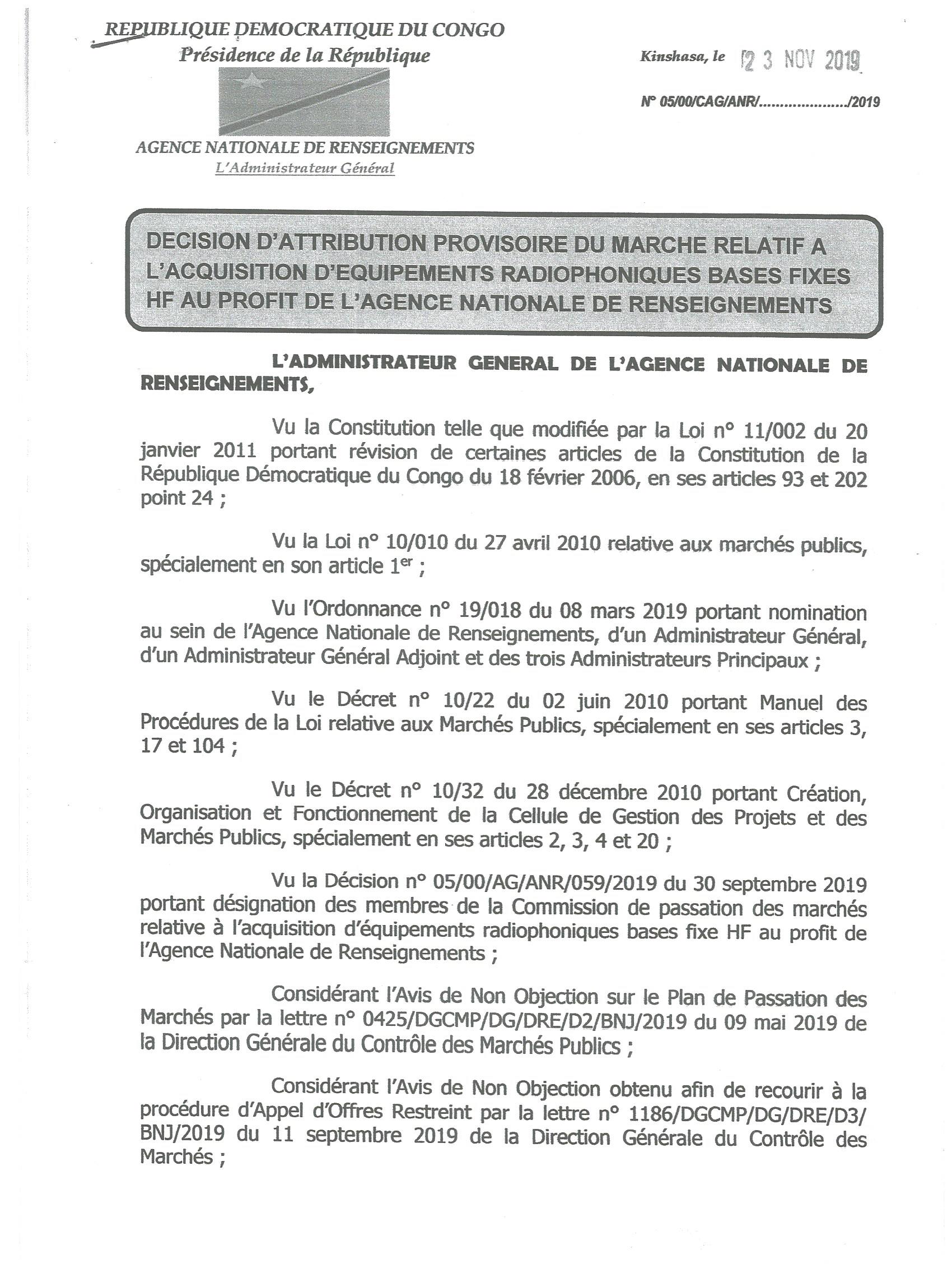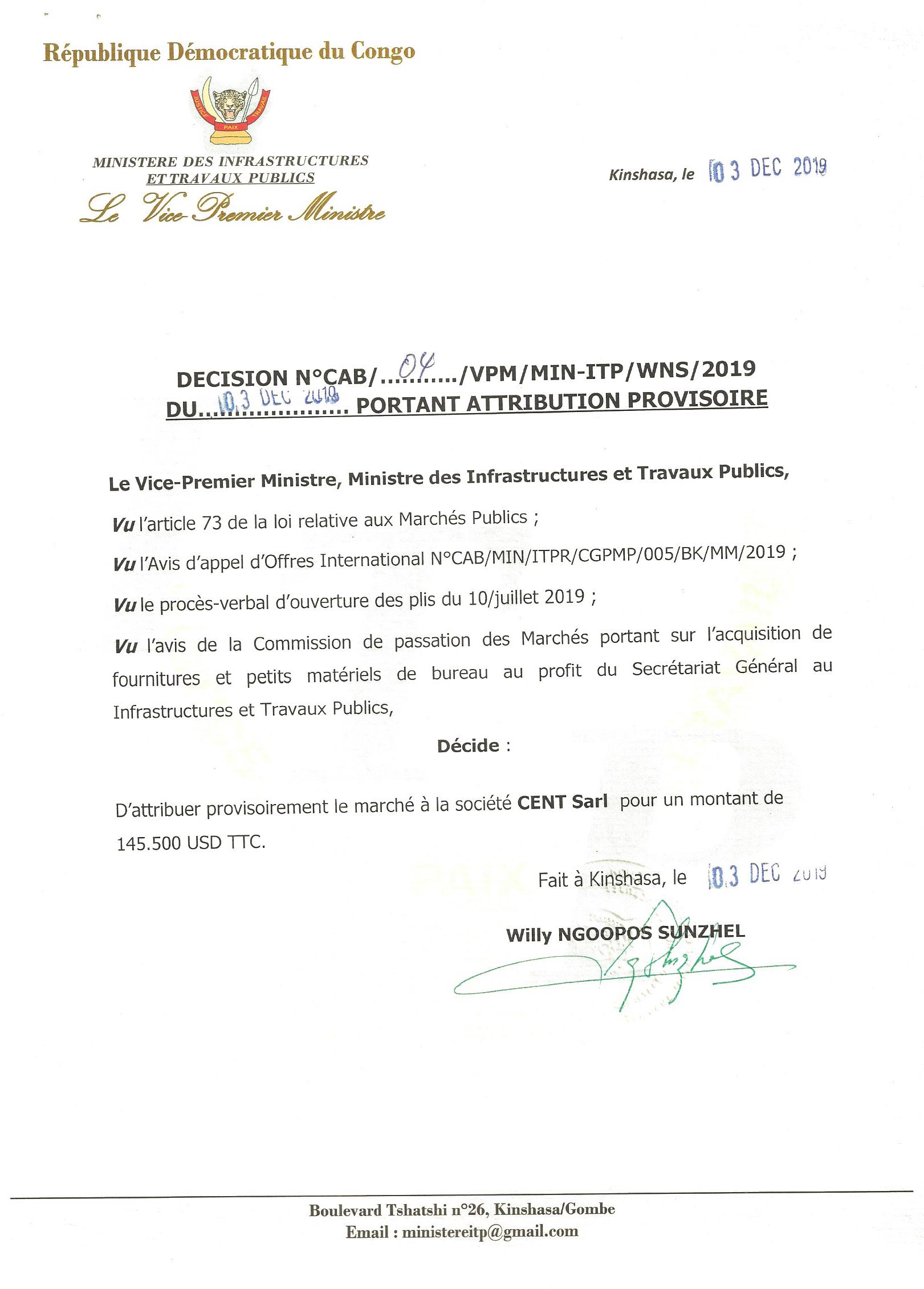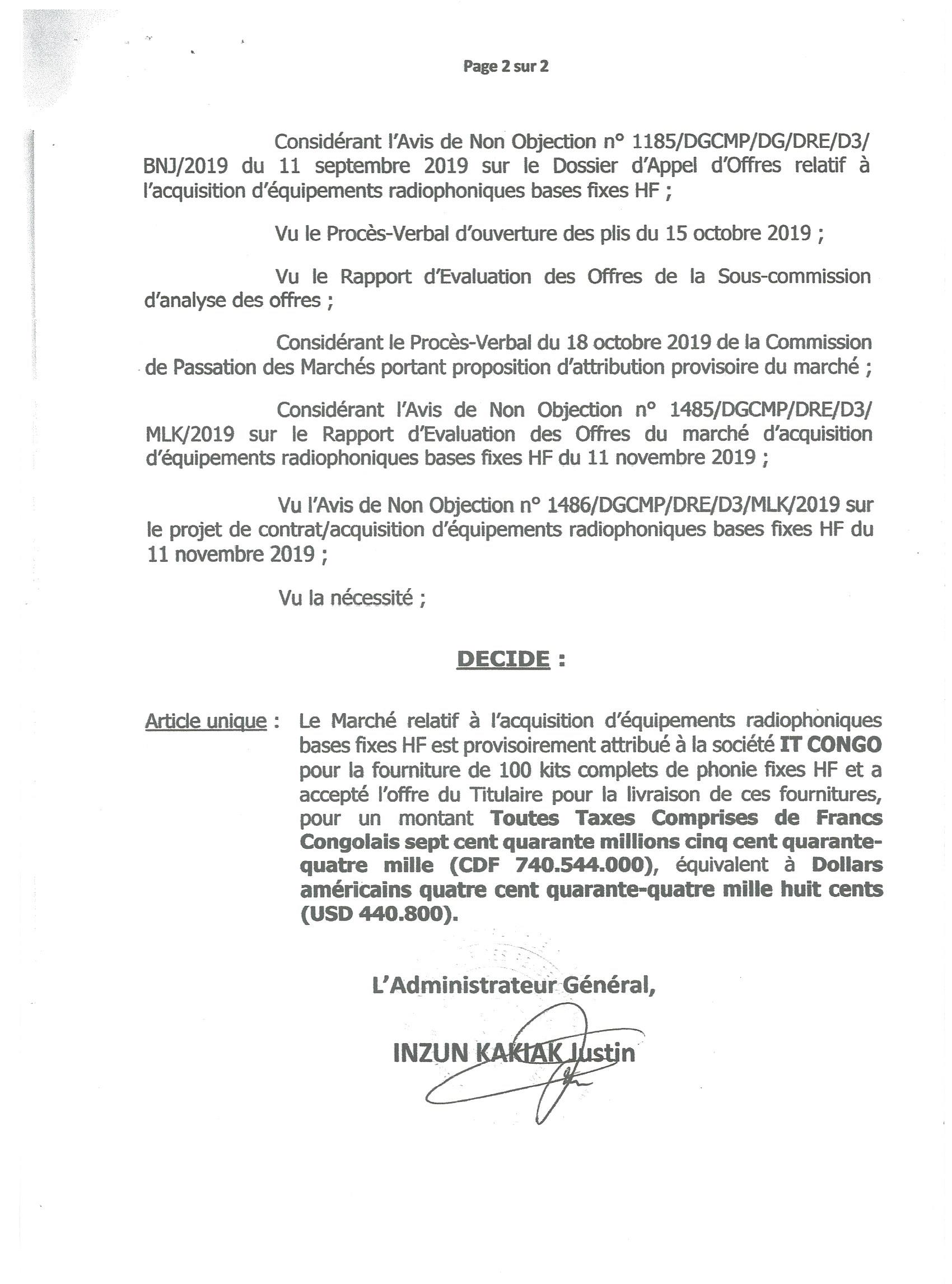 Décision d’attribution provisoire en faveur de la société IT CONGO pour la fourniture de 100 kits complets de phonie fixes HF.