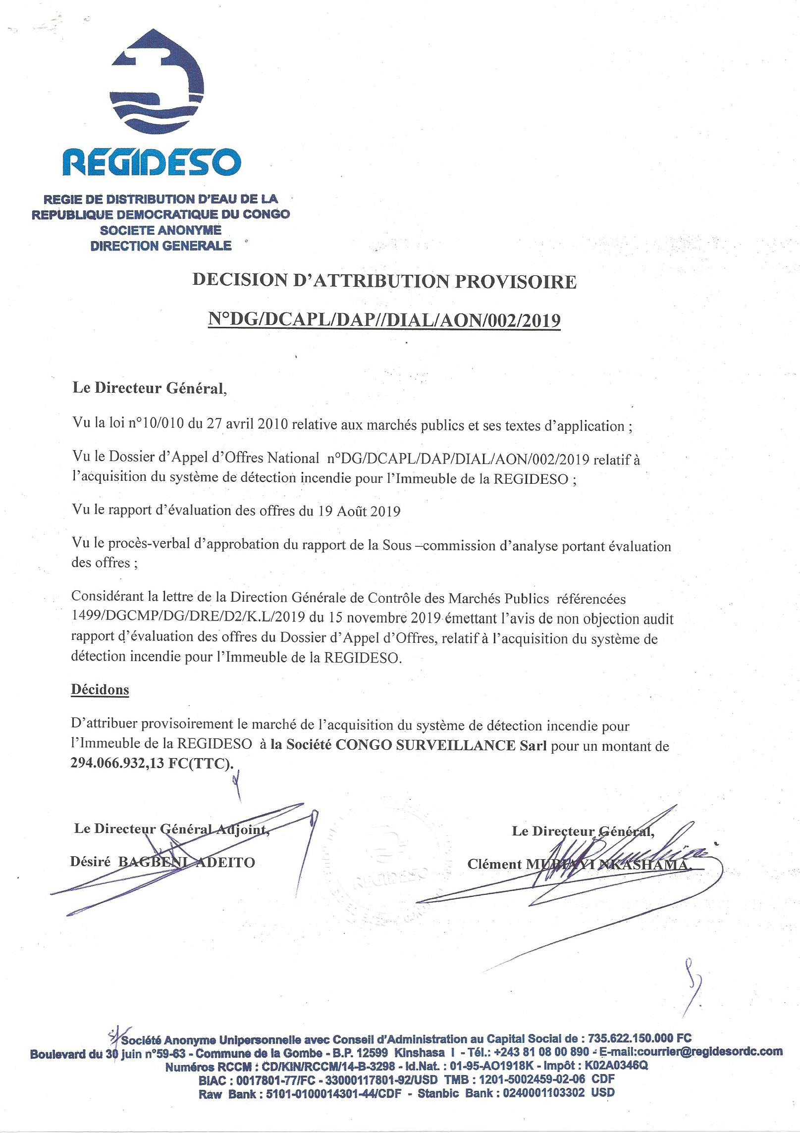 Attribution provisoire du marché d’acquisition du système de détection incendie pour l’immeuble de la REGIDESO à la société CONGO SURVEILLANCE SARL.