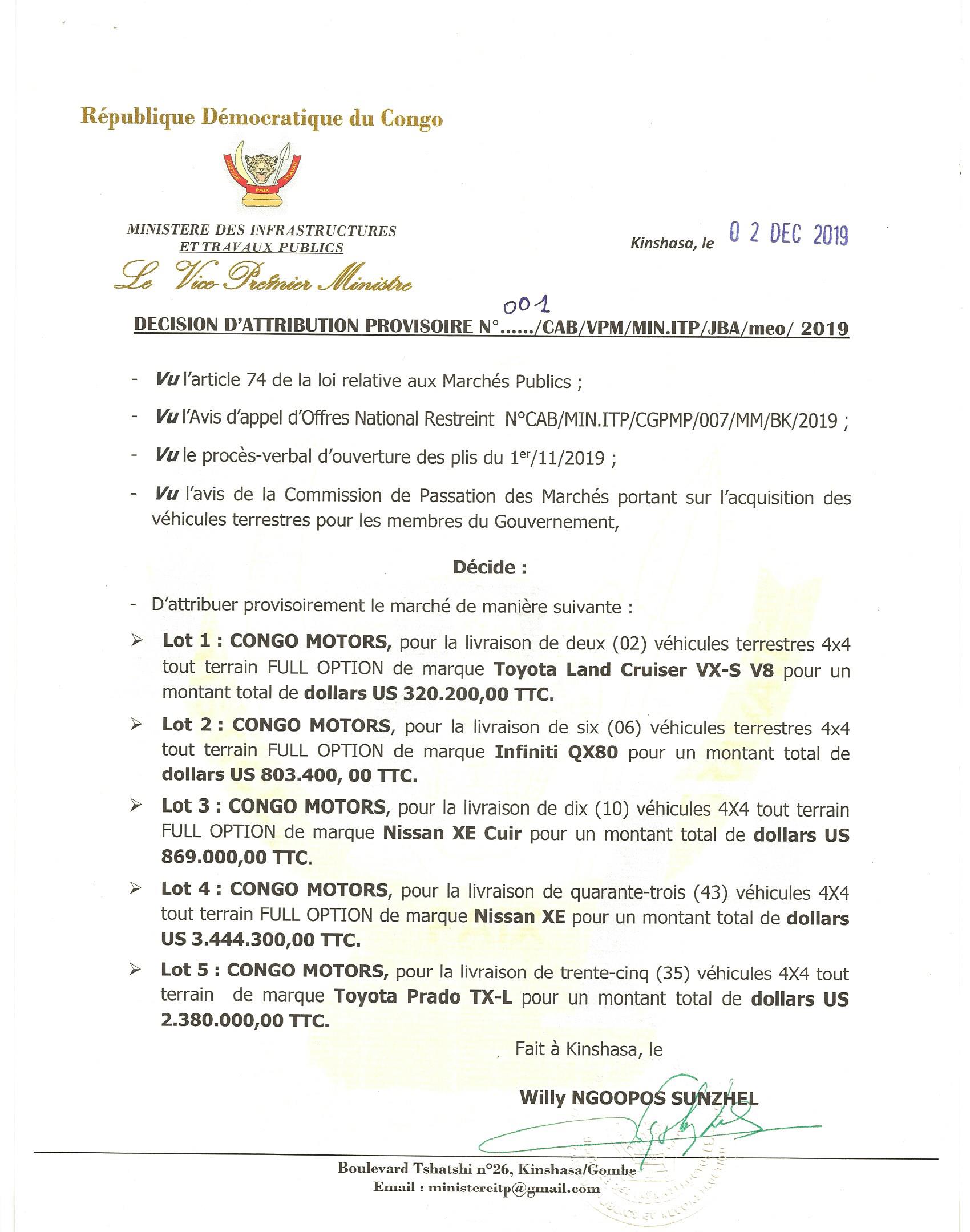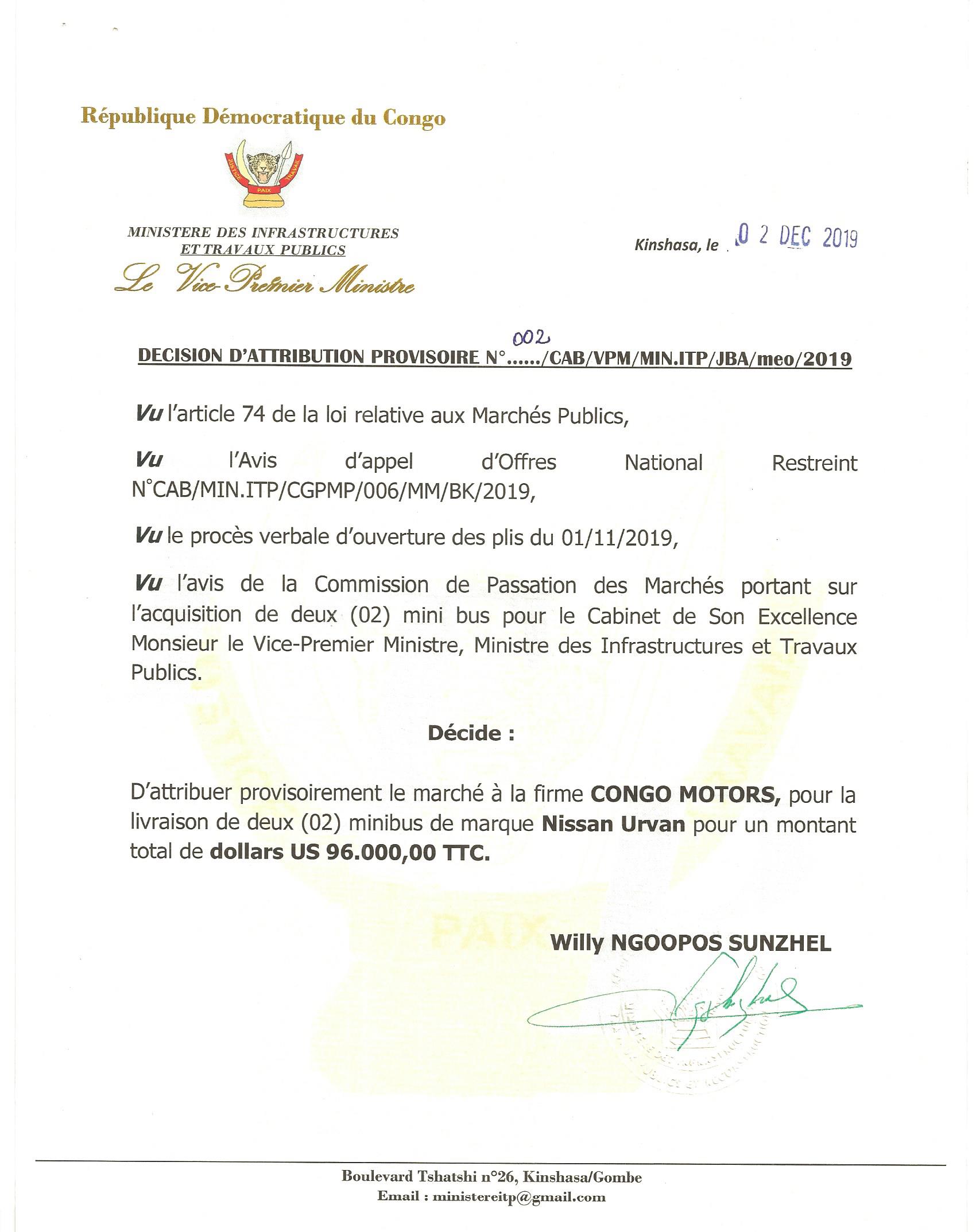 Deux décisions d’attribution provisoire en faveur de la société CONGO MOTORS pour le marché de fourniture des véhicules du gouvernement et de 2 minibus du cabinet VPM-ITP…