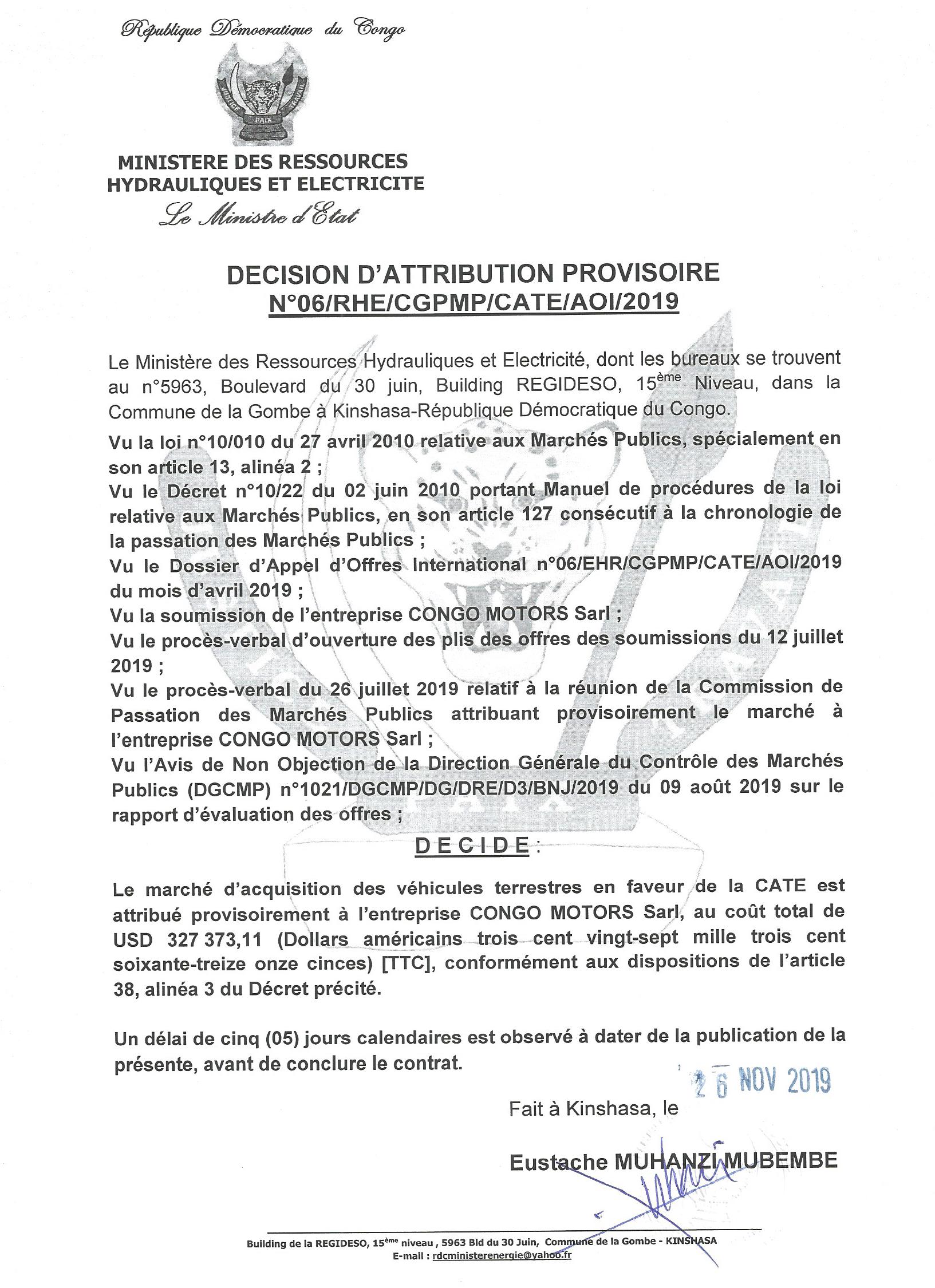 Attribution provisoire du marché d’acquisition des véhicules terrestres en faveur de la cate à l’entreprise CONGO MOTORS SARL.