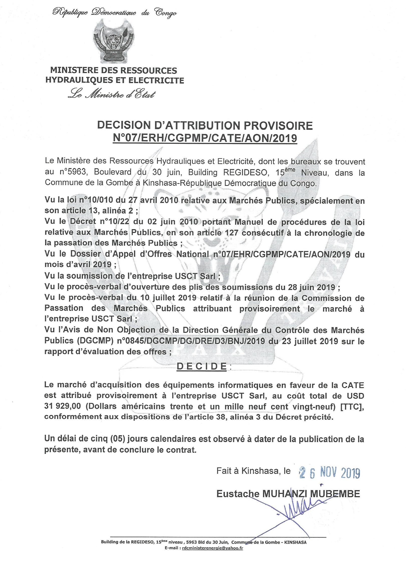 Attribution provisoire du marché d’acquisition des équipements informatiques en faveur de la cate à l’entreprise USCT SARL.