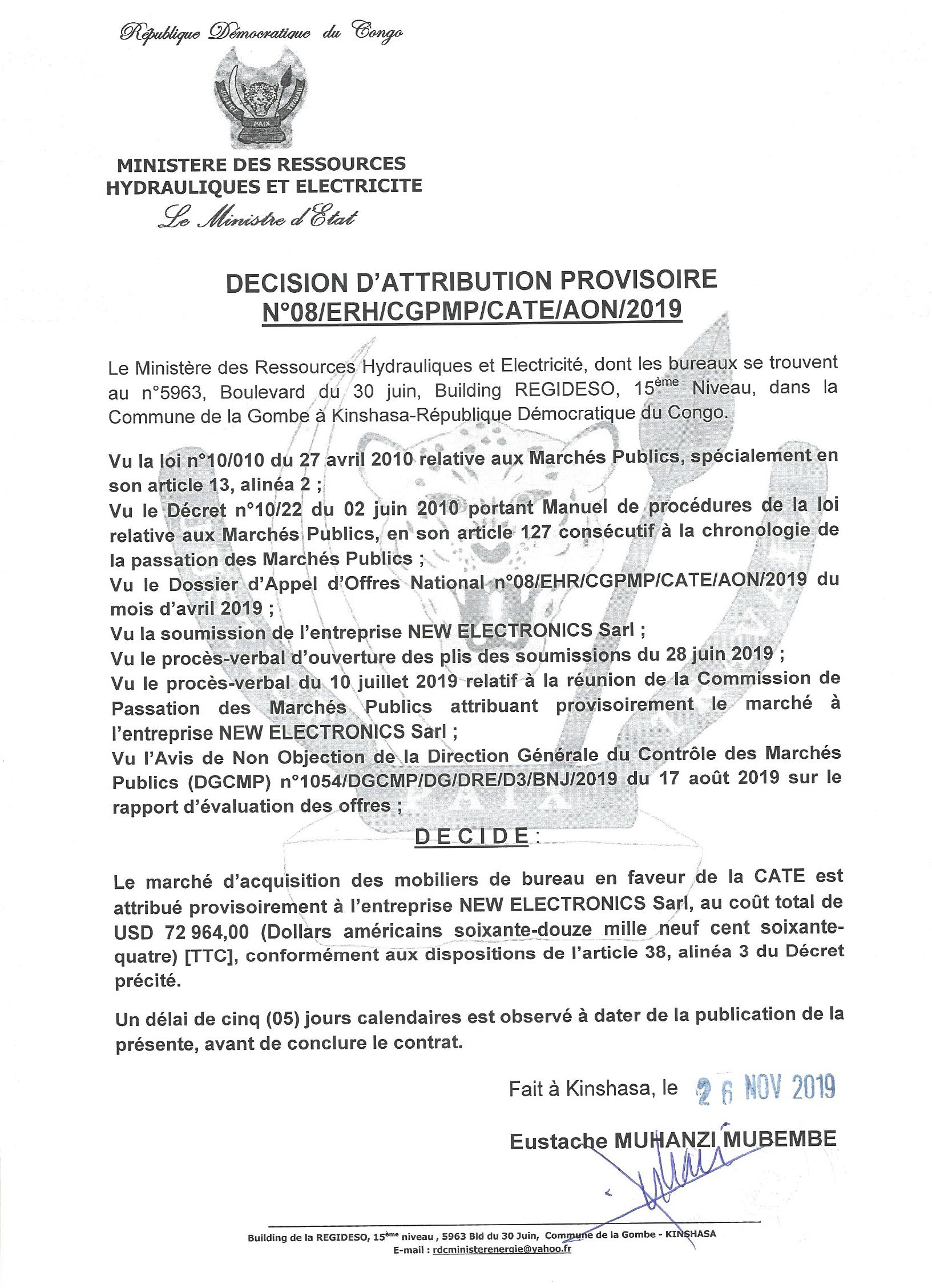 Attribution provisoire du marché d’acquisition des mobiliers de bureau en faveur de la cate à l’entreprise new ELECTRONICS SARL.