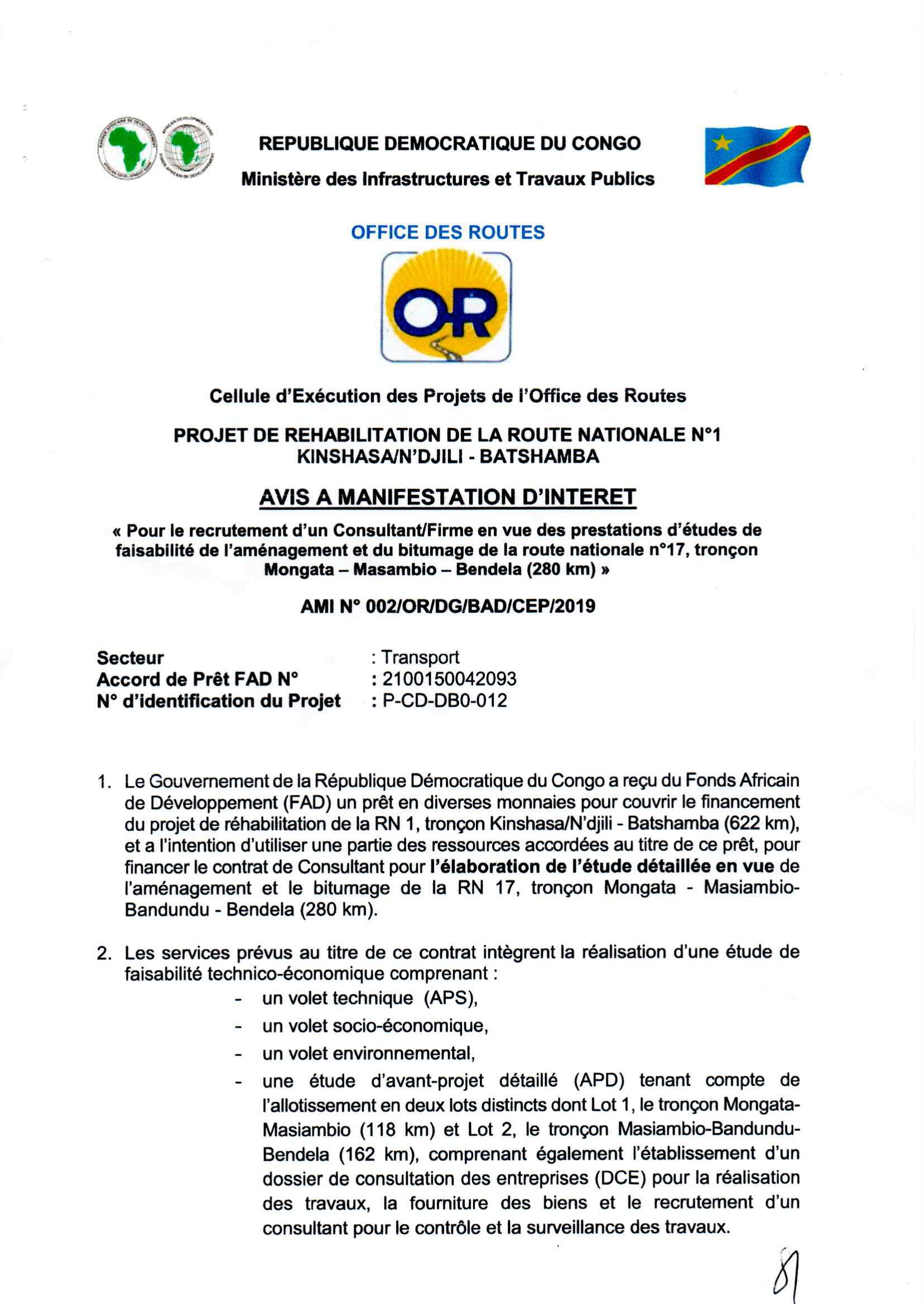 RECRUTEMENT D’UN CONSULTANT/FIRME EN VUE DES PRESTATIONS D’ÉTUDES DE FAISABILITÉ DE L’AMÉNAGEMENT ET DU BITUMAGE DE LA ROUTE NATIONALE N°17, TRONÇON MONGATA – MASAMBIO – BENDELA (280 KM).