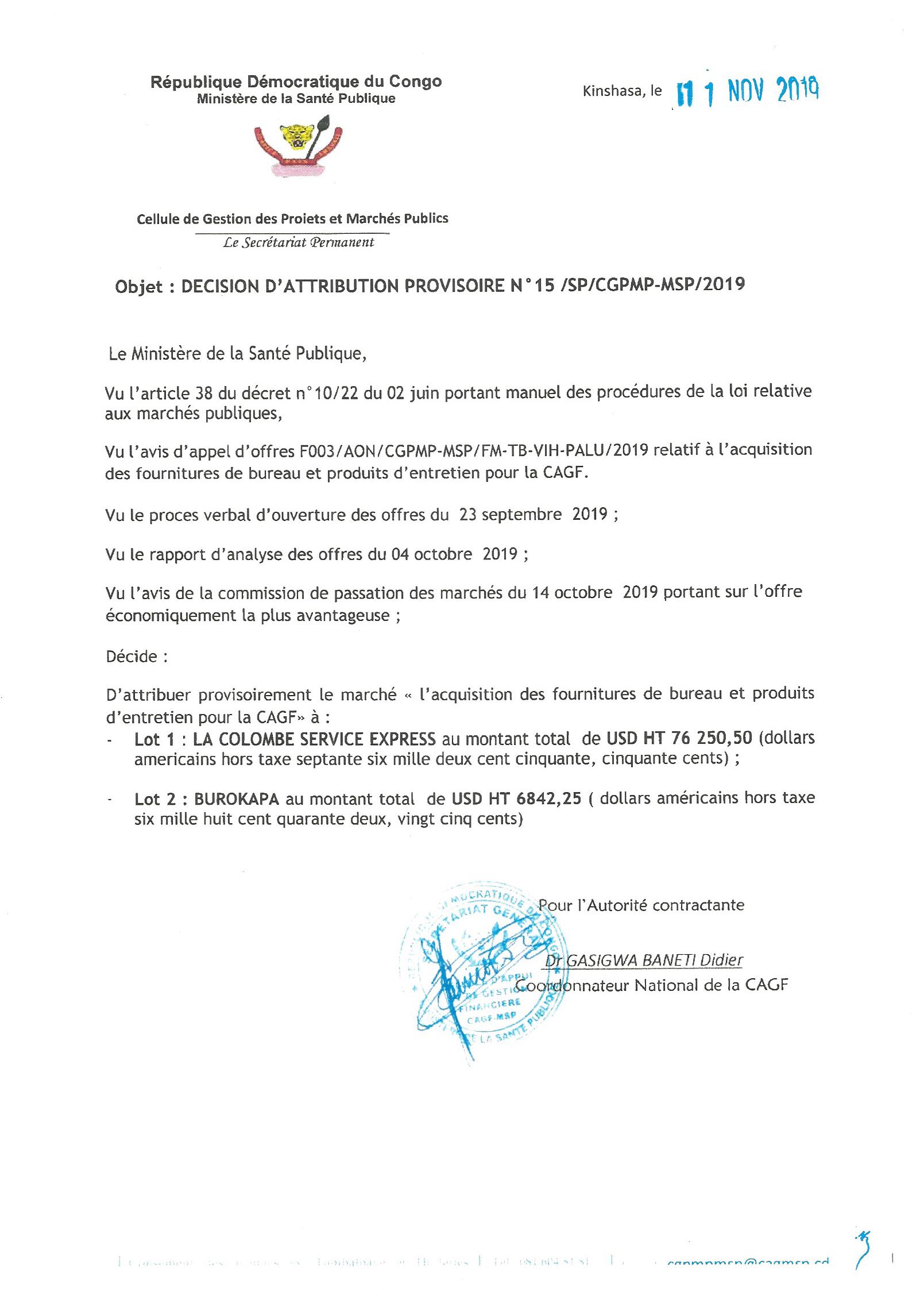 Attribution provisoire du marché relatif à l’acquisition des fournitures de bureau et produits d’entretien pour la cagf à : lot 1 à la colombe service express et lot 2 à burokapa.