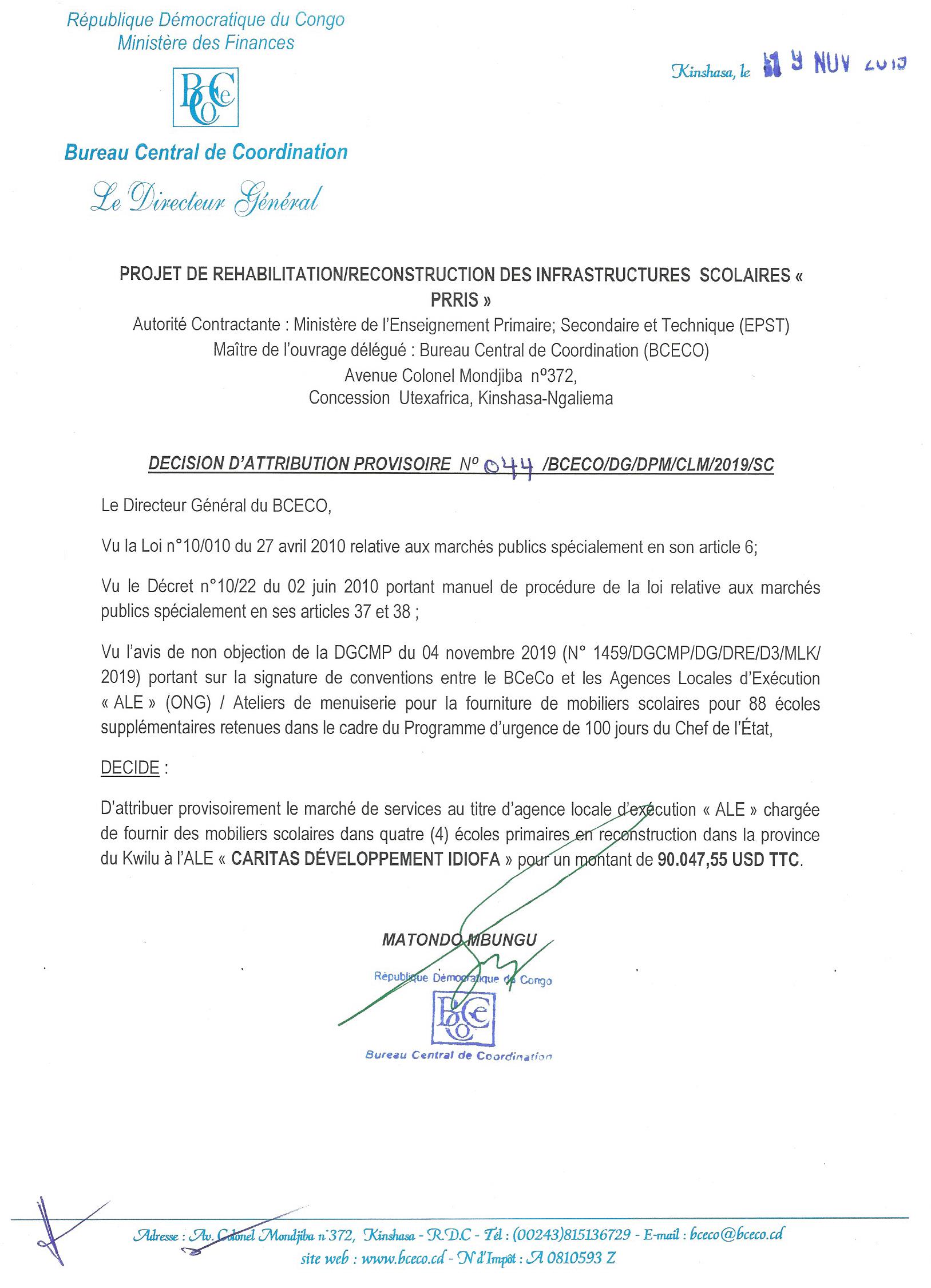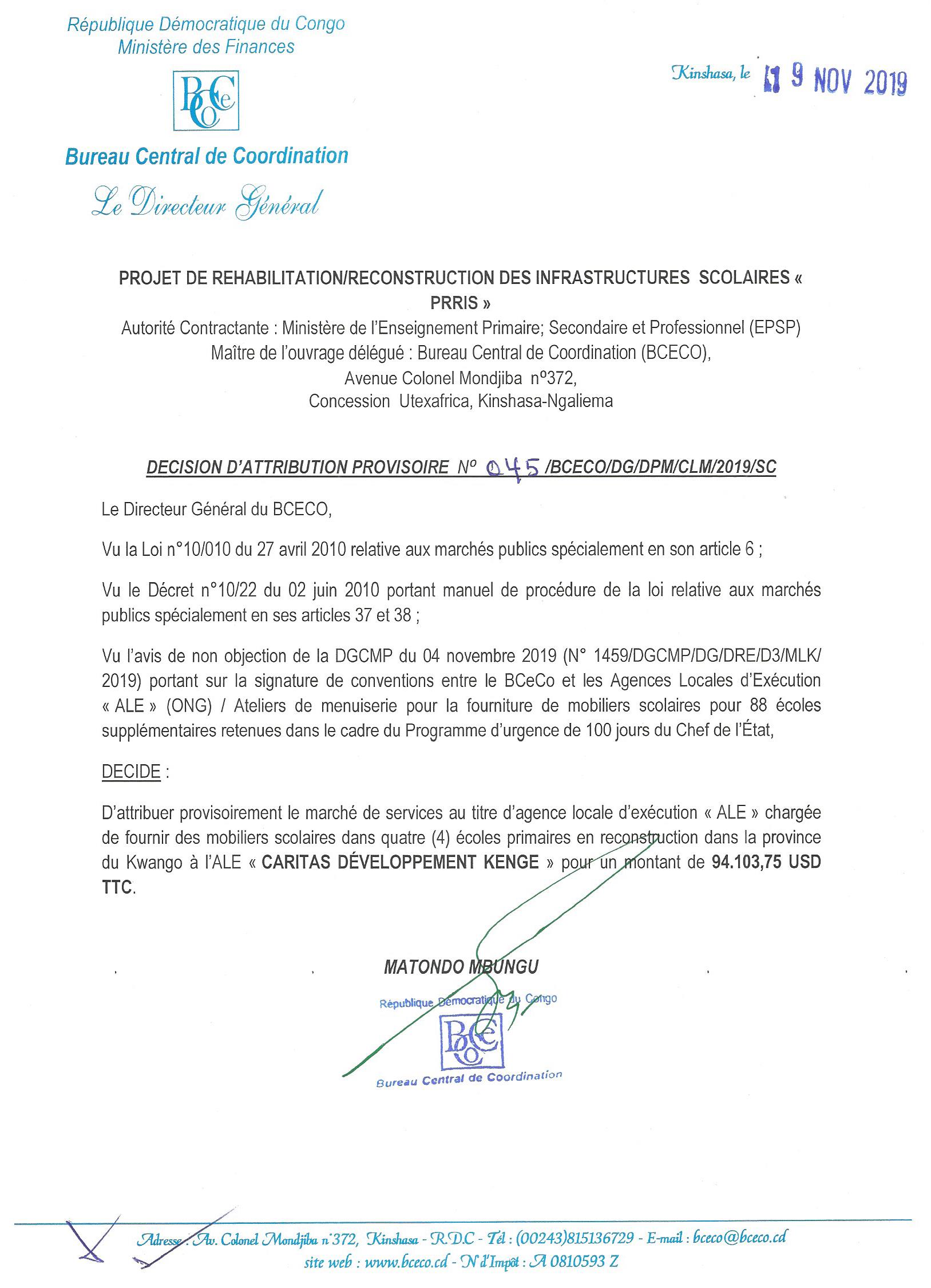 Attribution provisoire du marché de fournitures des mobiliers scolaires dans quatre (4) écoles primaires en reconstruction dans la province du kwilu à l’ale Caritas développement IDIOFA.