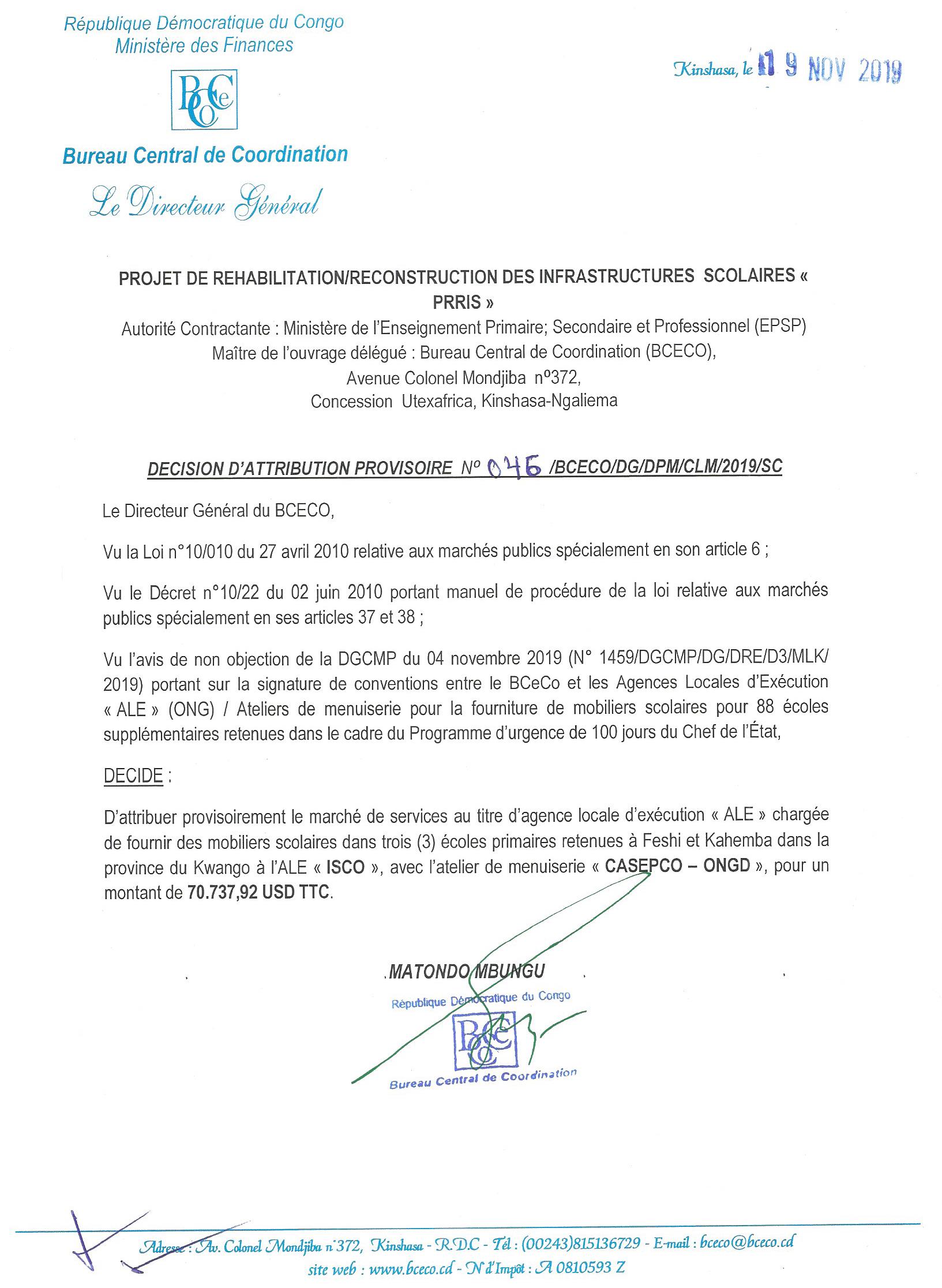 Attribution provisoire du marché de fournitures des mobiliers scolaires dans trois (3) écoles primaires retenues à feshi et kahemba dans la province du Kwango à l’ale « isco » et l’atelier « casepco-ongd ».