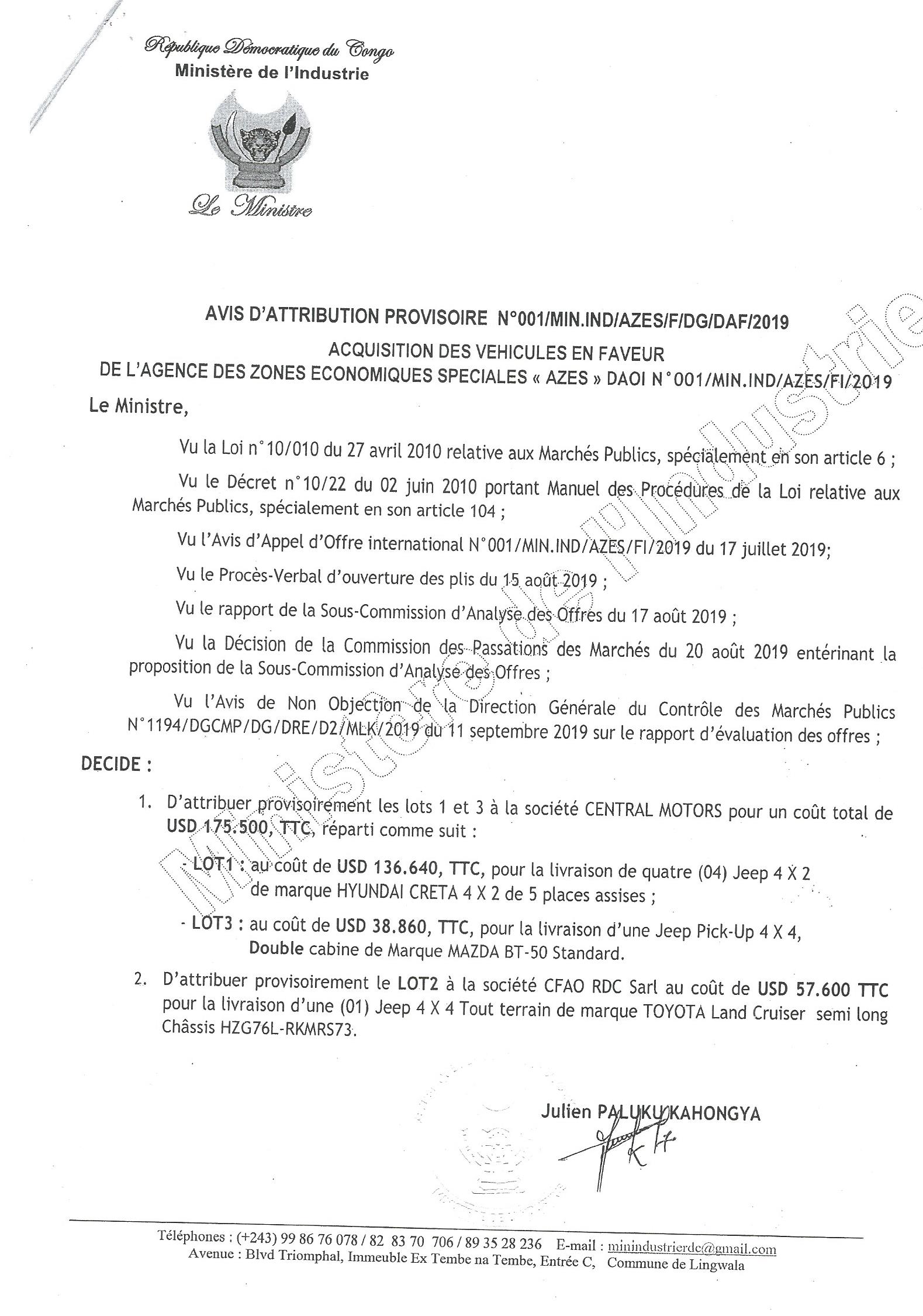 Attribution provisoire du marché d’acquisition des véhicules en faveur de l’agence des zones économiques spéciales « azes » à la société CFAO RDC SARL.
