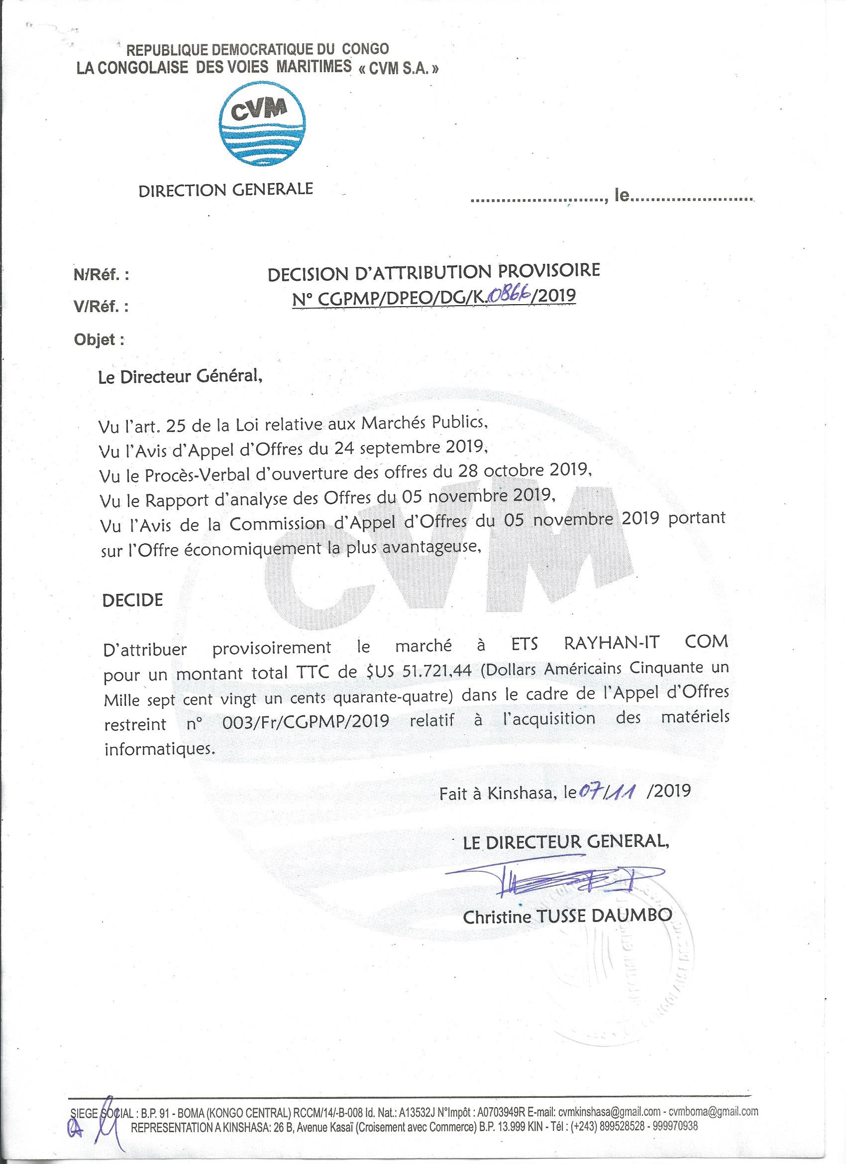 Attribution du marché relatif à l’acquisition des materiels informatiques.