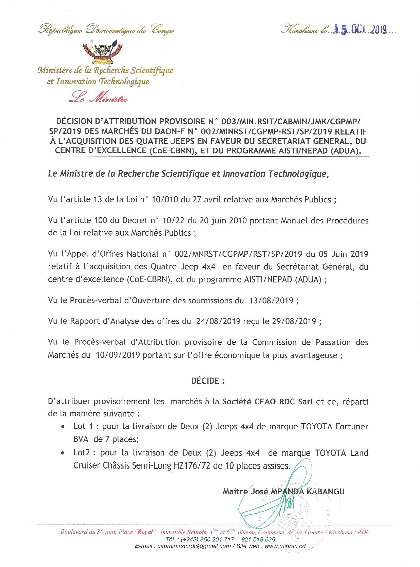 Attribution provisoire du marché relatif à l’acquisition des quatre jeeps en faveur du secrétariat général du centre d’excellence et du programme à la société CFAO RDC SARL.