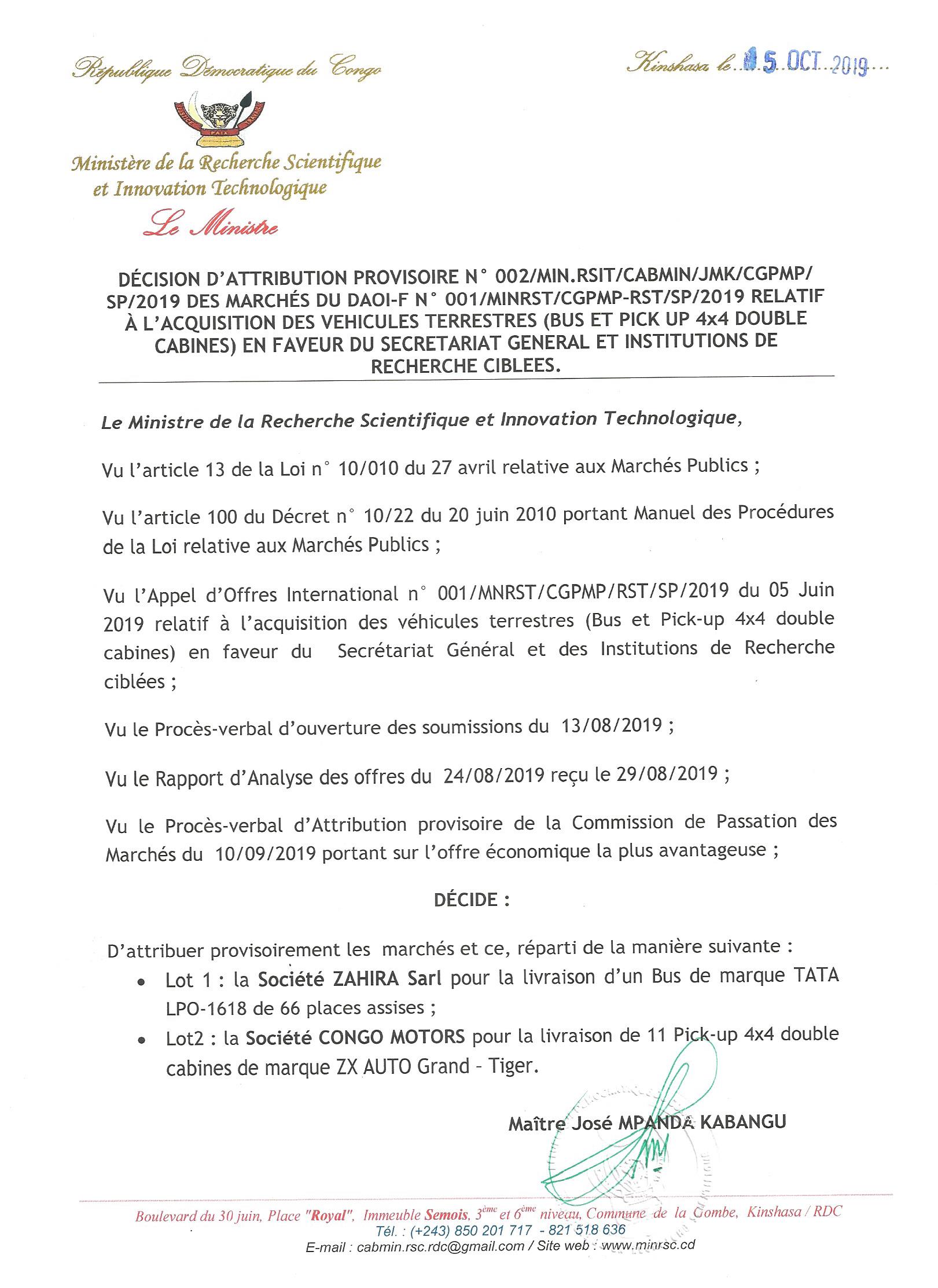 Attribution provisoire du marché relatif à l’acquisition des véhicules terrestres en faveur du secrétariat général : lot 1 à la société ZAHIRA SARL et lot 2 à la société Congo Motors.