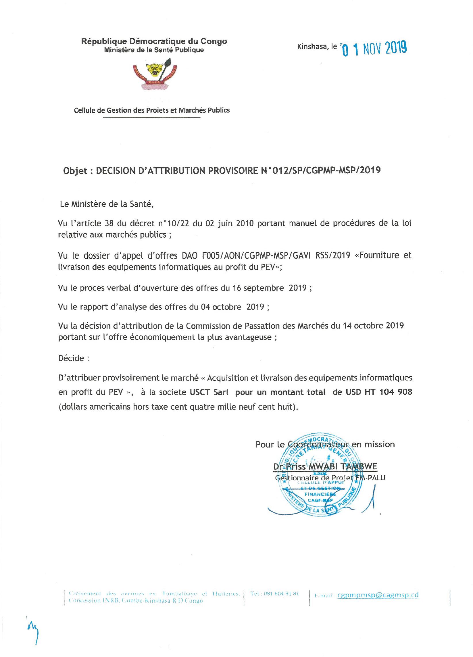 Attribution provisoire du marché d’acquisition et livraison des équipements informatiques en profit du pev, à la société USCT SARL.