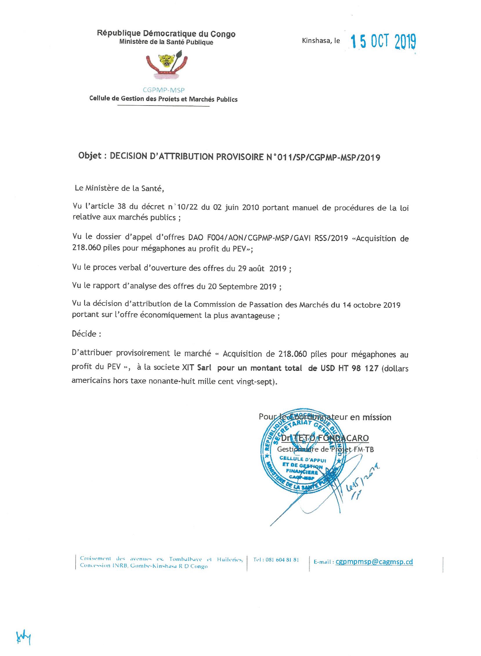 Attribution provisoire du marché d’acquisition de 218.060 piles pour mégaphones au profit du pev à la société XIT SARL.