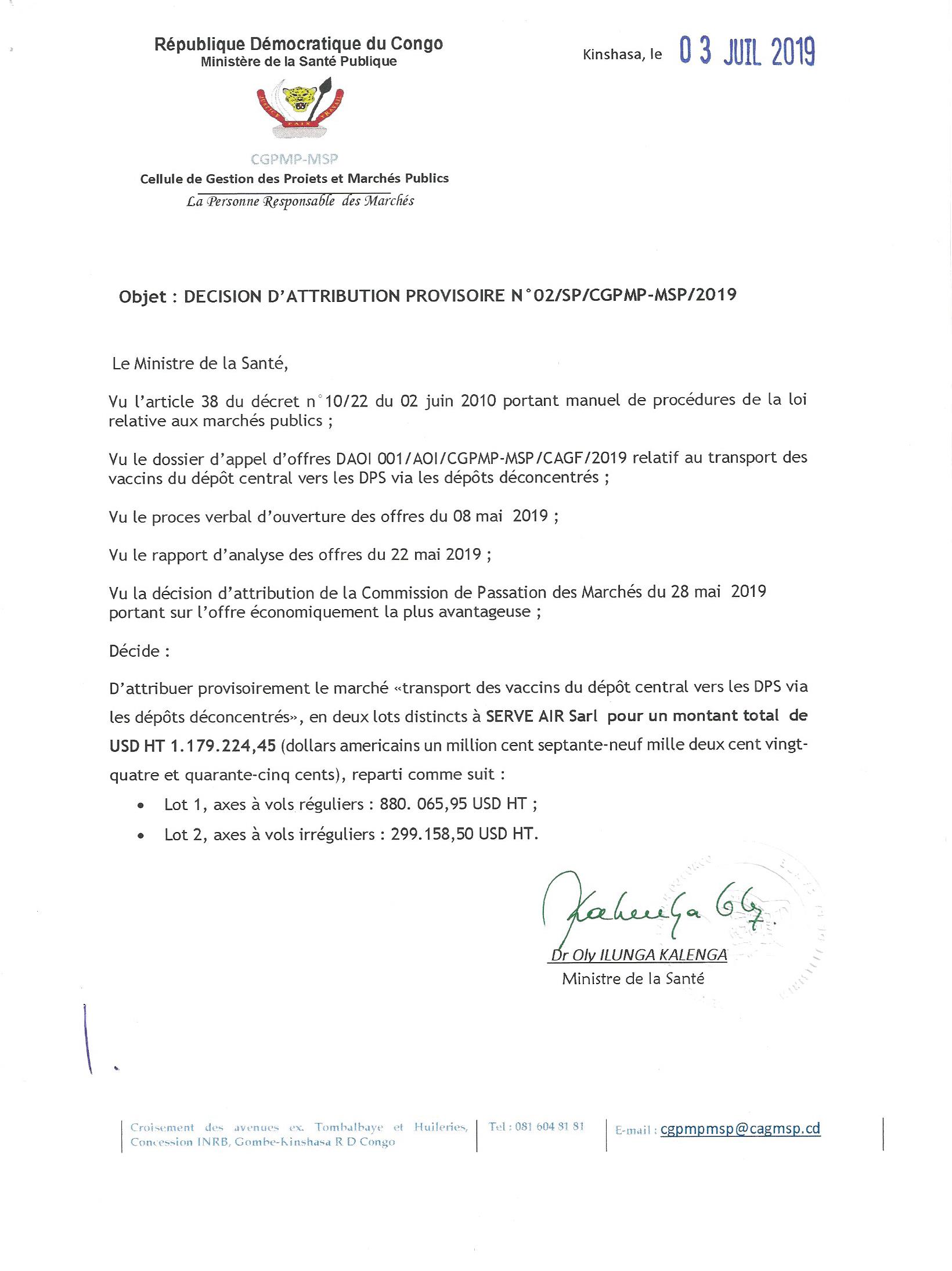 Marché relatif au transport des vaccins du dépôt central vers les dps via les dépôts déconcentrés à serve air sarl.