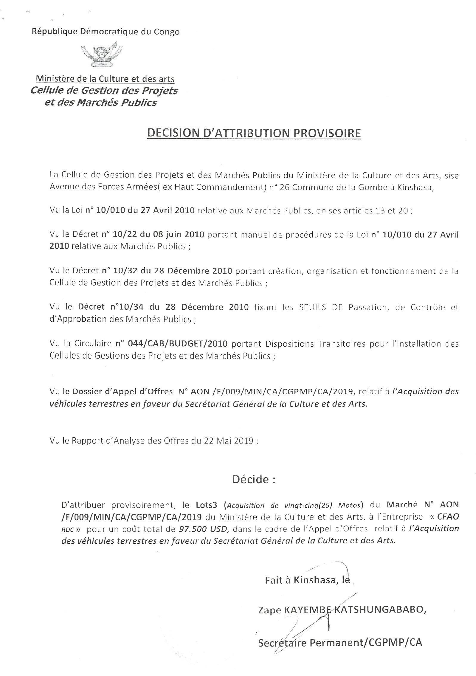 Attribution provisoire du marché relatif à l’acquisition des véhicules terrestres en faveur du secrétariat général de la culture et des arts/ lot 3.