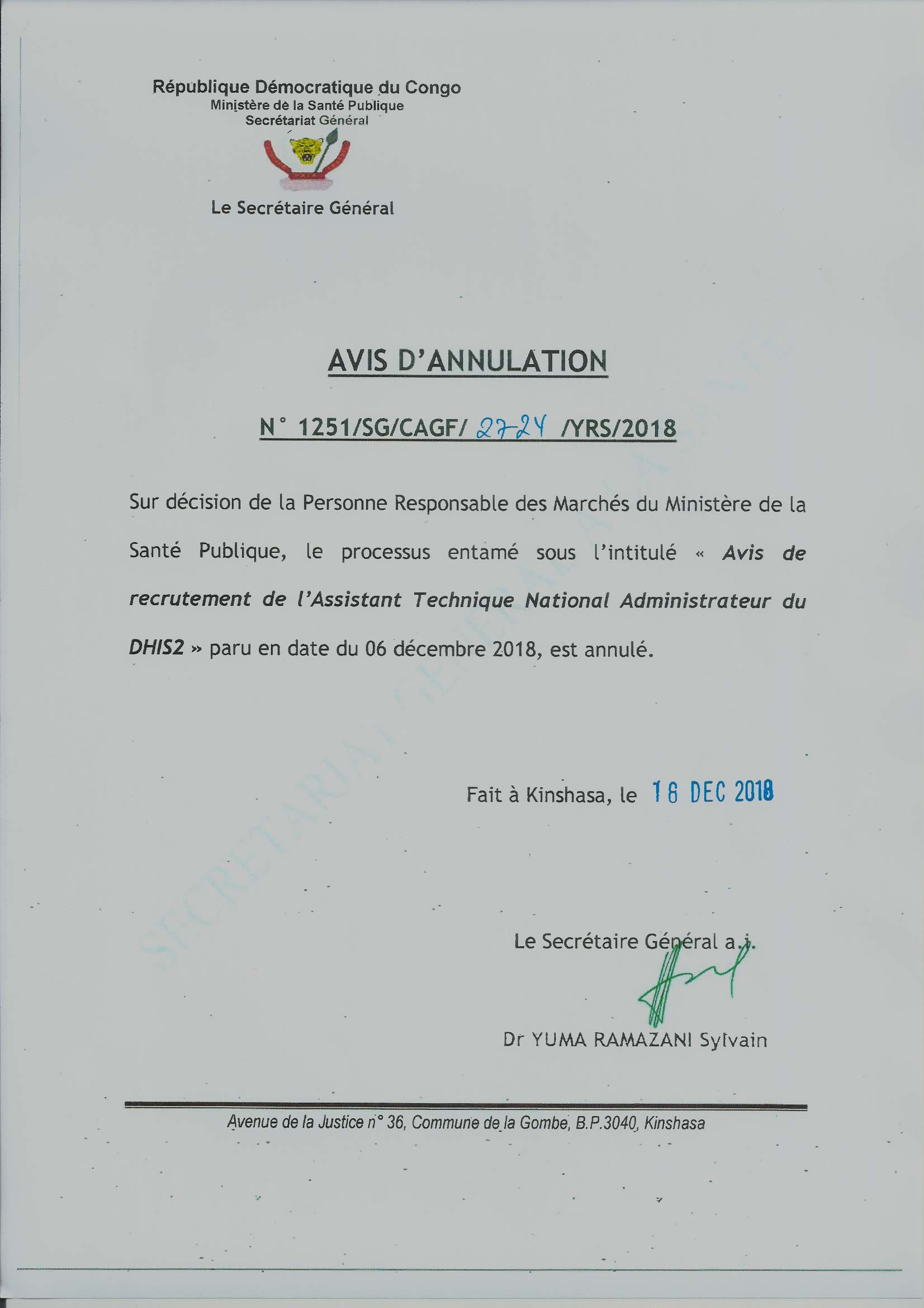 AVIS D’ANNULATION DE L’AVIS DE RECRUTEMENT DE L’ASSISTANT TECHNIQUE NATIONAL ADMINISTRATEUR DU DHIS2