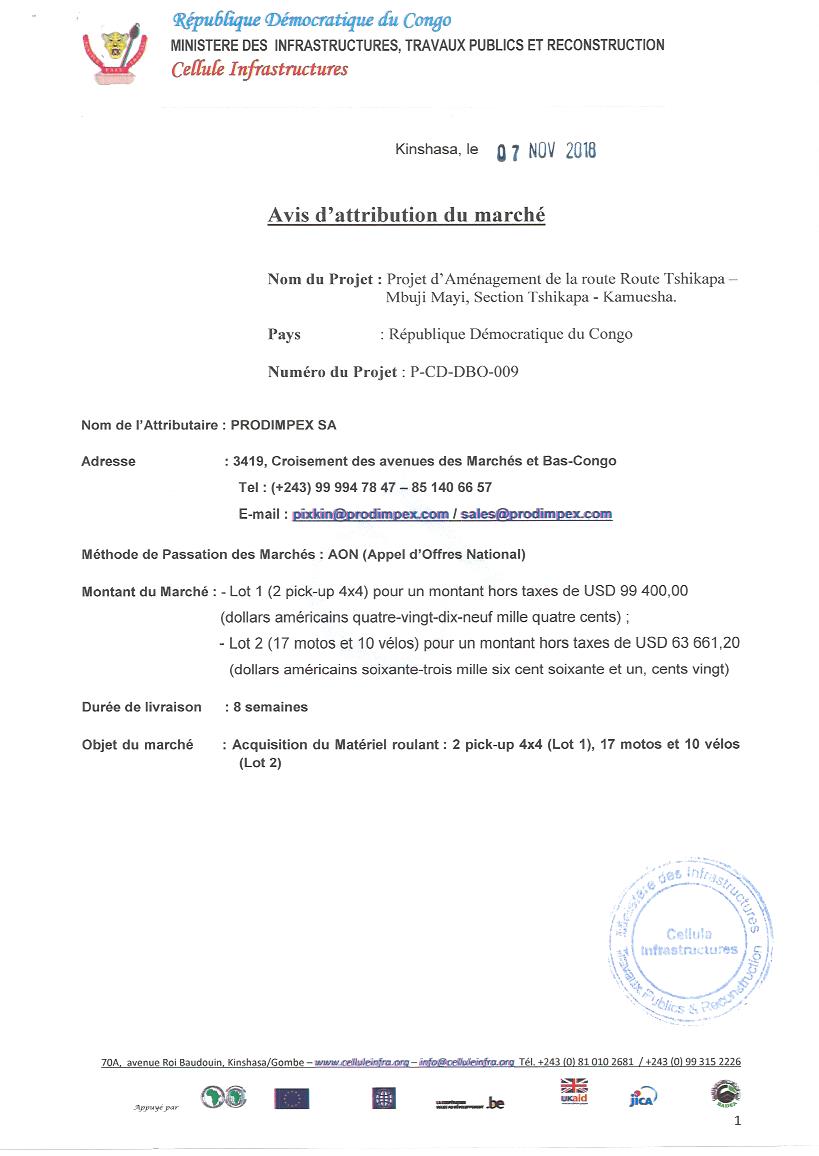 Attribution du marché d’acquisition du matériel roulant : 2 pick-up 4×4 (lot 1), 17 motos et 10 vélos (lot 2) à PRODIMPEX SA.