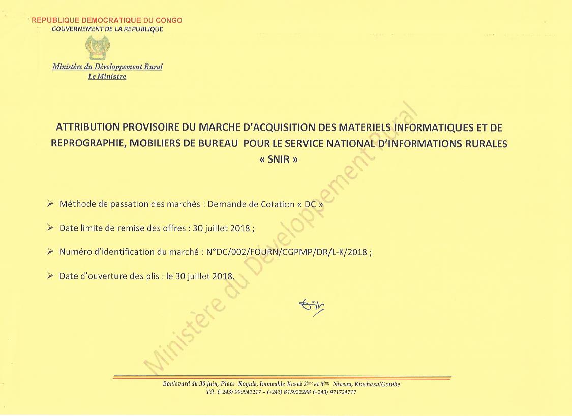 Attribution provisoire du marché d’acquisition des matériels informatiques et de reprographie, mobiliers de bureau pour le service national d’informations rurales « snir » à l’établissement ACCI.