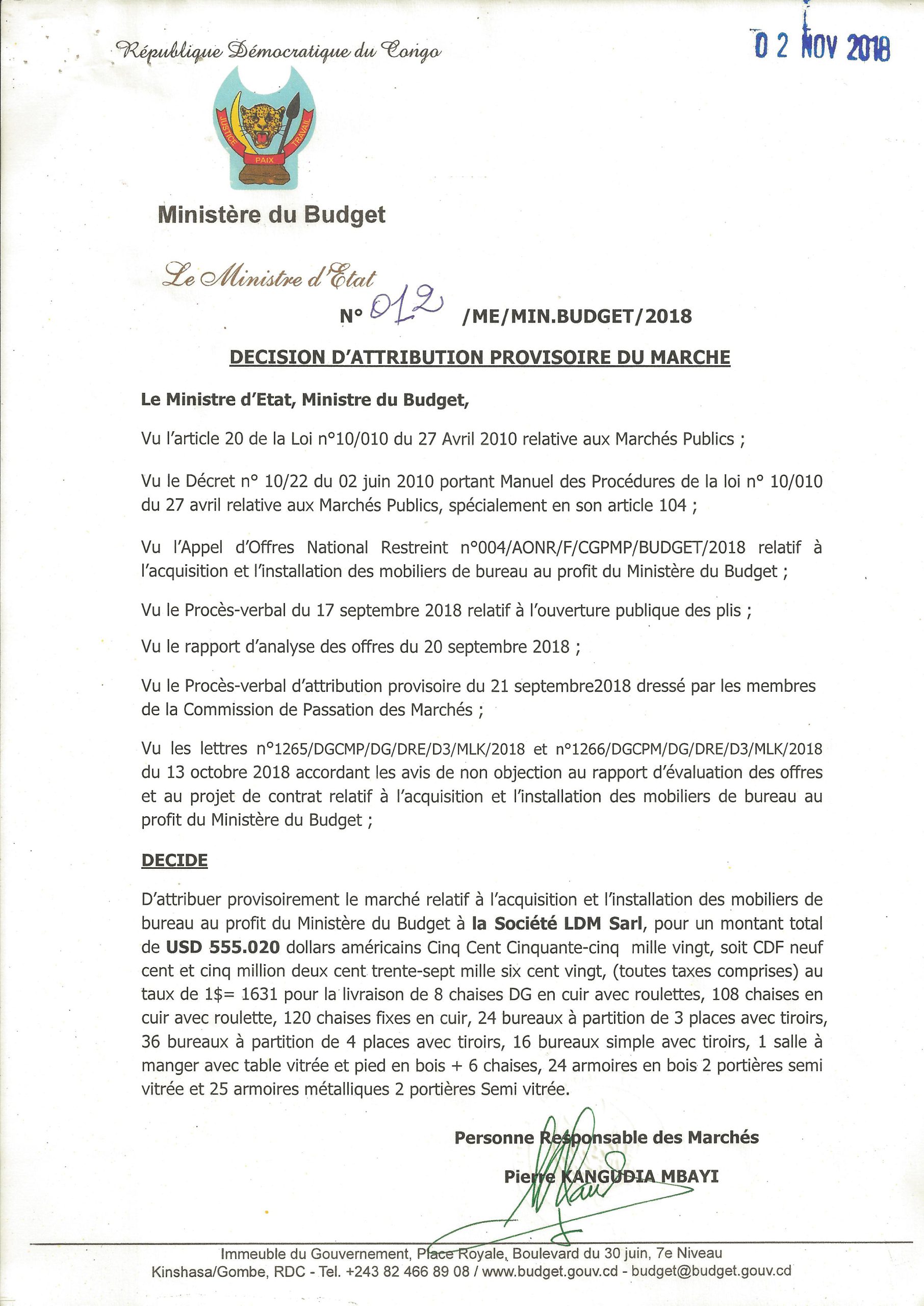 Attribution provisoire du marché relatif à l’acquisition et l’installation des mobiliers de bureau au profit du ministère du budget à la société LDM SARL.